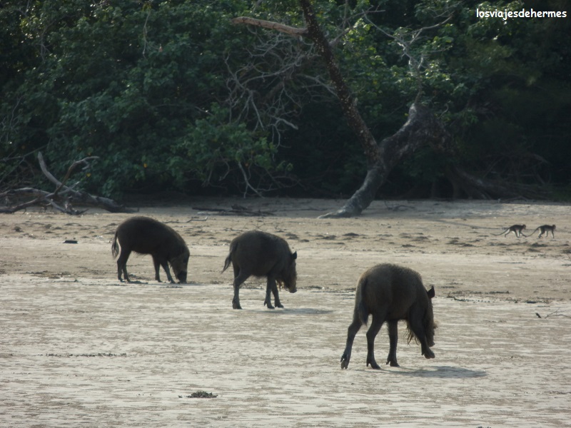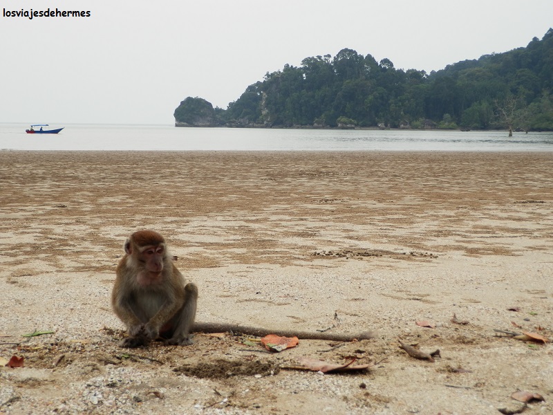 En poco tiempo salimos a mar abierto dirigiéndonos a la bahía de Teluk Assam, suponiendo una media hora de barco, y desembarcando en la misma arena, desde donde había unas preciosas vistas de las montañas que cercaban dicha bahía haciéndonos algunas fotos y despidiéndonos de momento de nuestros compañeros pues a las 4 de la tarde regresaríamos. En la misma playa se podían ver monos de cola larga y jabalíes barbudos rebuscando en la arena, y es que este lugar es privilegiado en cuanto a flora y fauna, siendo el animal estrella el extraño mono narigudo que tuvimos la gran suerte de encontrar.