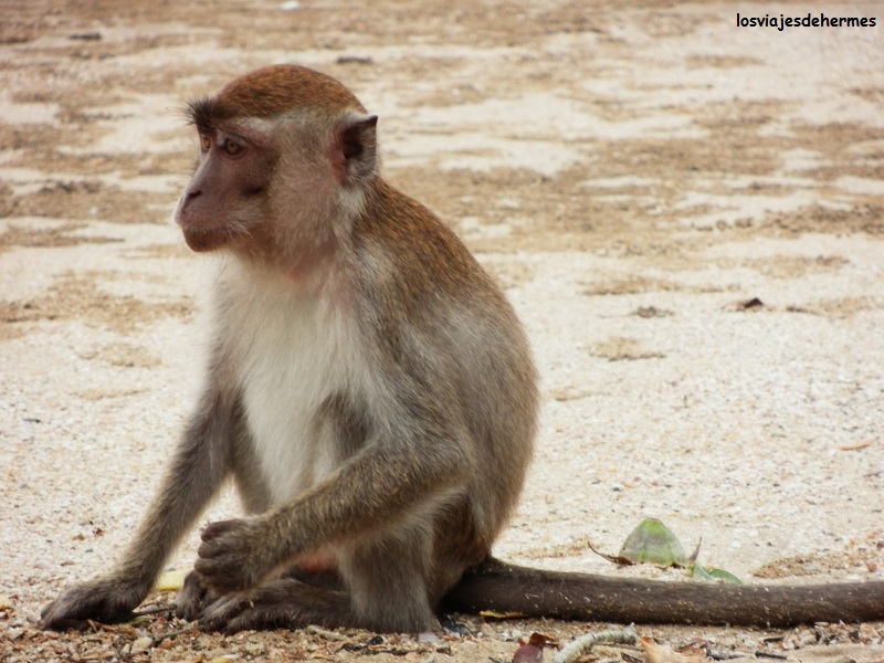 Durante el ascenso pudimos escuchar y entrever a monos de otro tipo, bastante huidizos, y disfrutar de una cerrada vegetación, llegando al punto abierto desde el que se veía la playa y bahía de Teluk Assam. Regresamos a la oficina central llegando media hora antes de la salida del último barco (a las 16 horas), que aprovechamos para pasear por la playa y observar a los monos de cola larga, con los que hay que tener cuidado, pues vimos como intentaban robar algo a unos turistas, así como los jabalíes y otro mono narigudo que apareció en un árbol y que si no llego a estar atento me mea encima. Nos juntamos con la pareja de antes contándonos cómo nos había ido el día durante el trayecto de vuelta y a tiempo de coger el bus nº 1 de las 16.30 horas (3,50 MYR=0,86 € cada uno). El resto de la tarde fue de descanso y relajación en la zona común, saliendo sólo para cenar al “Little Lebanon” del paseo por 16 MYR=3,94 € los dos.