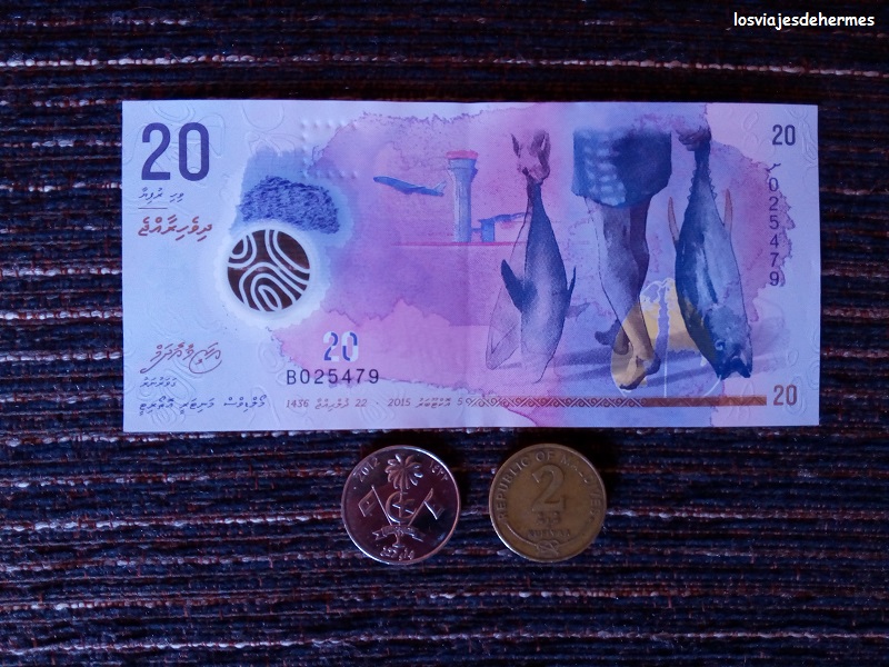 La moneda local es la rupia de Maldivas o Rufiyaa (MVR), que viene bien para pequeños gastos (cambiamos algunas en el aeropuerto de Male a 1 €=15,71 MVR), si bien es posible pagarlo casi todo en dólares americanos, que en ese momento estaba a 1 €=1,04 $, cambiando en España antes del viaje (enlace a xe.com).