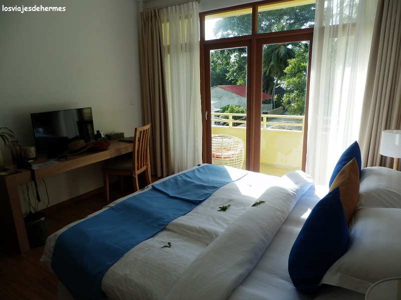 Tengo que comentar que el trato con el personal del Plumeria fue exquisito desde el minuto uno, con el personal de cocina, de limpieza, los camareros y por supuesto mención especial para Magda y Jose, que nos hicieron sentir como en casa y con los que uno no se aburre. El Plumeria Guest House lo reservamos en booking y fue todo un acierto, de los mejores alojamientos en los que hemos estado, limpieza impecable, hasta dos veces al día la habitación y haciendo figuritas con las toallas, unos artistas vaya, aire acondicionado, nevera con minibar, TV (para quien la quiera una vez más), un pequeño balcón, baño completo, desayuno buffet incluido, wifi…no le falta de nada, además desde el balcón veíamos el mar, pues tienen dos edificios y nos alojaron en el más cercano a la playa, que también cuenta con mesa de billar, futbolín y hasta unas pequeñas bicis para darse una vuelta por la isla, en el otro está el comedor y hay una pequeña piscina que también podíamos usar.