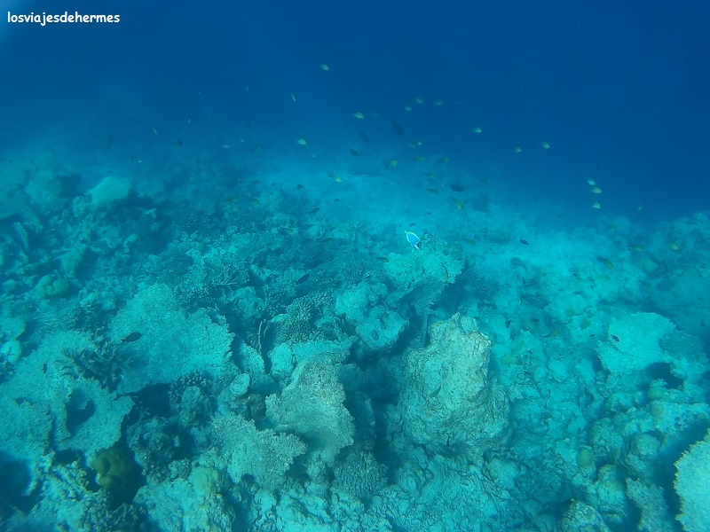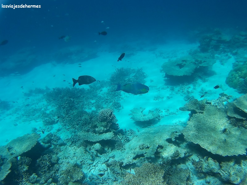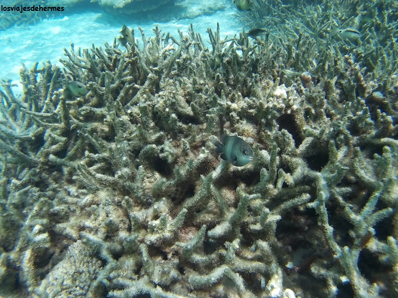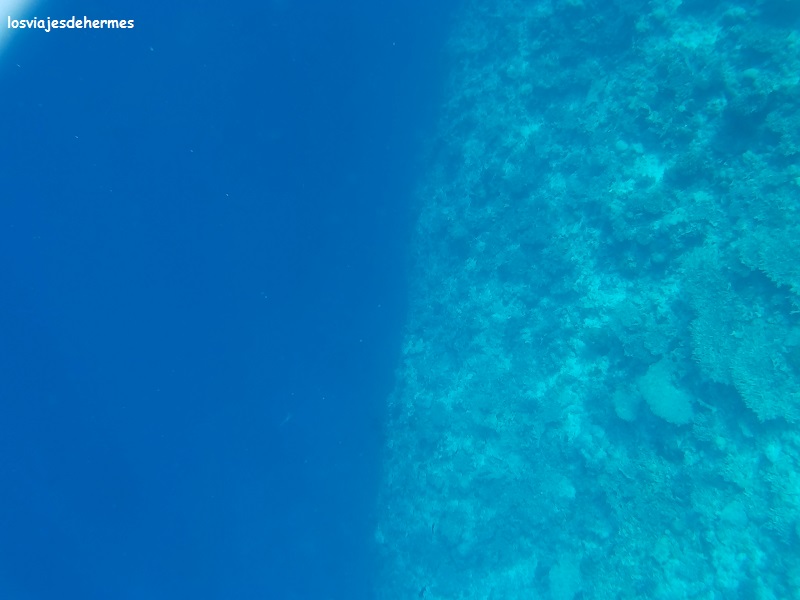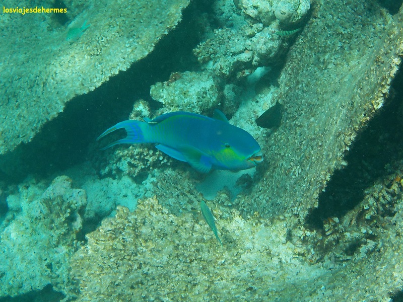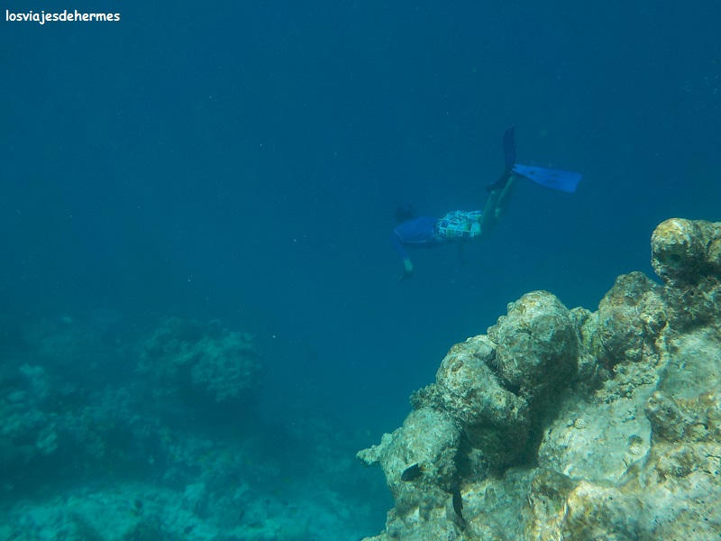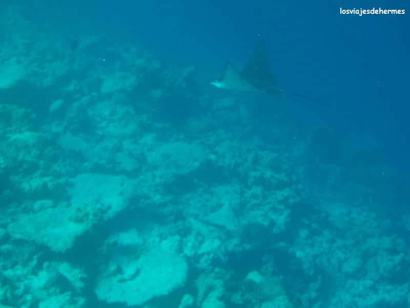 Felices con el desayuno nos fuimos directamente al agua para bucear en la pared del arrecife siguiendo el recorrido a favor de la corriente que Jose nos había recomendado, entrando por un canal despejado de coral y muy visible desde la playa más cercana al hotel, que no es bikini beach, si bien con una camiseta de agua para ellas fue suficiente, saliendo después por otro canal, no tan claro el primero, cerca de donde empezaba la bikini beach. Entre un punto y otro se va en la dirección de la corriente y en la zona donde el arrecife se pierde de vista en la profundidad, que sin duda es una de las que más vida tiene y donde más posibilidades hay de ver animales grandes, como así fue, pues nada más llegar a la pared nos recibió un águila de mar con su majestuoso vuelo acuático, disfrutando después de los clásicos peces loro, unicornio y muchos más cuyos nombres desconozco (no es que sólo hubiera loros y unicornios. Algún pequeño tiburón de puntas negras se dejó ver también en la segunda pasada que dimos.