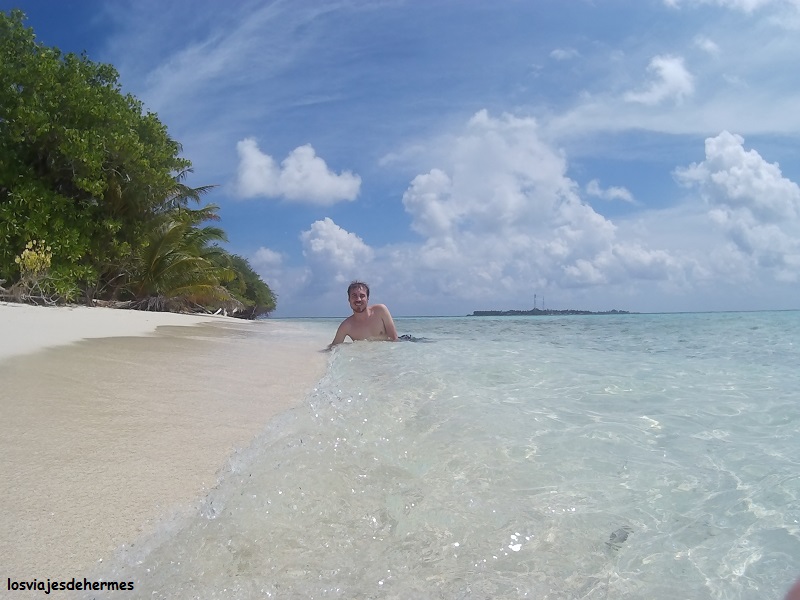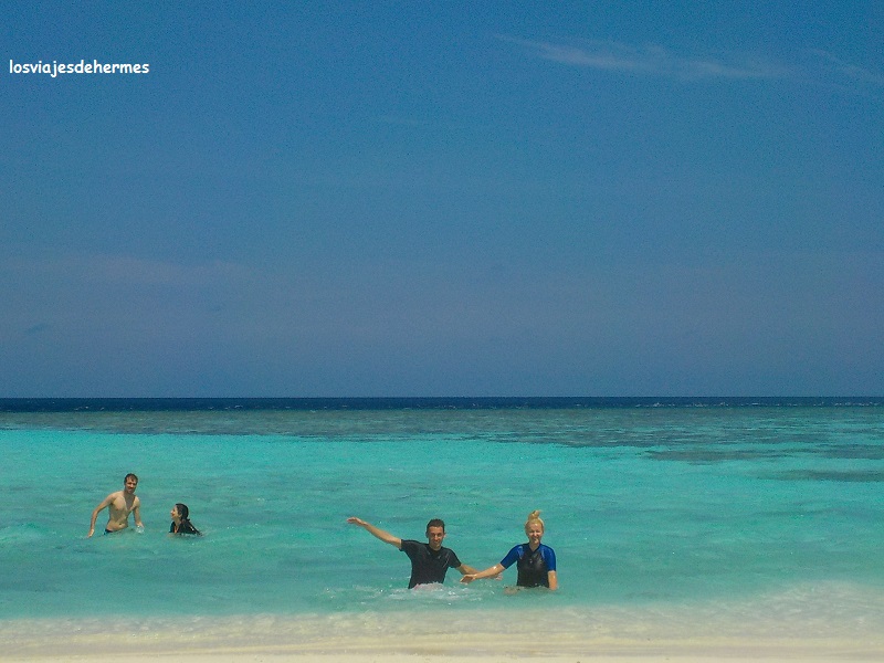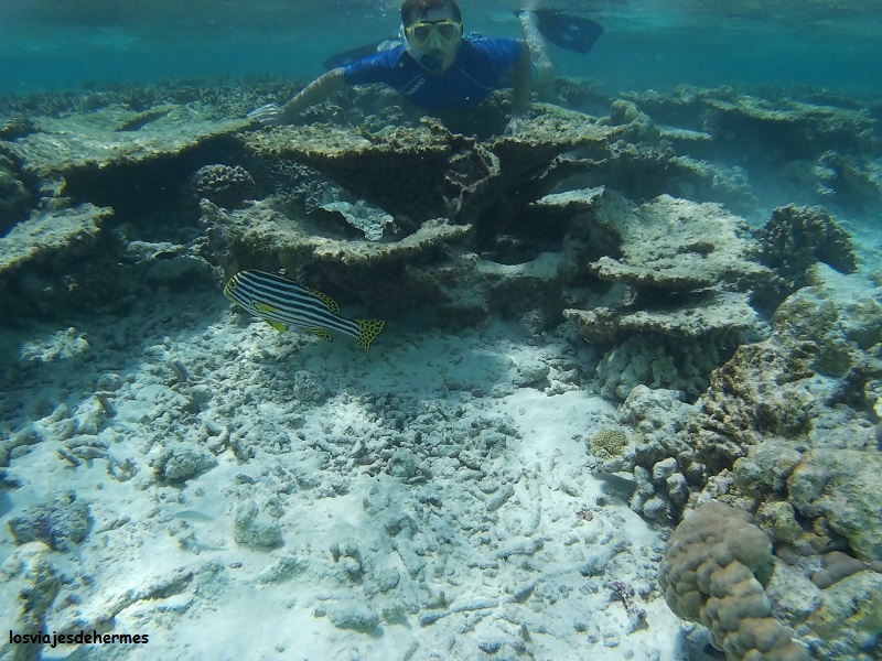 No nos aventuramos muy lejos por la fuerte corriente que además empujaba hacia fuera, pero con cuidado llegamos al borde del arrecife y a una zona llena de vida con bancos de peces de todos los colores y de lo más bonito. Intercalamos ratos de buceo con descansos en la arena y en la orilla, disfrutando a tope de la mañana y olvidándonos del resto del mundo, una maravilla la verdad. De regreso en el pueblo comimos por segundo día en el restaurante local, esta vez noodles y sin picante, todo muy bueno de nuevo, cobrándonos más que el día anterior (325 MVR=19,82 € por pareja) porque hubo pastel de postre.
