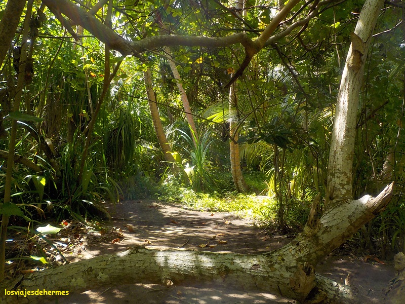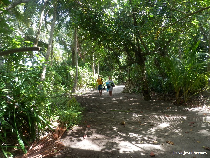 Sin grandes planes a la vista y con la única idea de pasar el día tranquilo en la isla marchamos a la bikini beach, en su extremo suroeste, por lo que atravesamos la zona de selva en pocos minutos y nos acomodamos al final de las palmeras y junto a la orilla. El lugar es de postal, con la característica arena que deslumbra y las mencionadas palmeras a escasos metros de un agua que no podía ser más cristalina, como en toda la isla vaya, y por si encima no tuviéramos suficientes alicientes resulta que la playa estaba a tope de tiburones de aleta negra pequeñitos, que nadaban tranquilamente sin apenas fondo. Enseguida nos metimos en el agua y con mucha paciencia y movimientos lentos conseguimos verlos de cerca y fotografiarlos bastante bien, incluso me crucé con uno que superaría el metro de longitud al avanzar un poco.