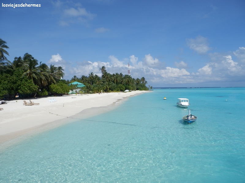 Comimos en el ferry algo de “comida basura” que compramos en Maafushi, haciendo constar que se pueden adquirir bebidas y alguna cosilla más a bordo. El día era estupendo para pasar la mayor parte del trayecto en el techo, bien pertrechados de crema solar y prenda de cabeza, gozando de las vistas, del mar, del aire…en definitiva de estar en un paraíso, llegando a la isla de Thinadhoo pasadas las 3 de la tarde. A pie de muelle nos recibió Magda, una chica polaca que trabajaba en el Plumeria, nuestro alojamiento en la isla, poniéndonos al día de todo en sólo unos minutos con gran amabilidad. Una vez instalados tanto ella como Jose, un canario que está allí como instructor de buceo, nos dieron una charla referente a las excursiones que organiza el propio centro de buceo del hotel, que a decir verdad sonaban muy bien y a un precio asequible, sobre todo nos llamó la atención el buceo nocturno con tiburones, y es que fue oírlo y tanto mi hermano como yo nos balanceábamos nerviosos ya en nuestras sillas 😀 , eso lo haríamos seguro, y fue al día siguiente.