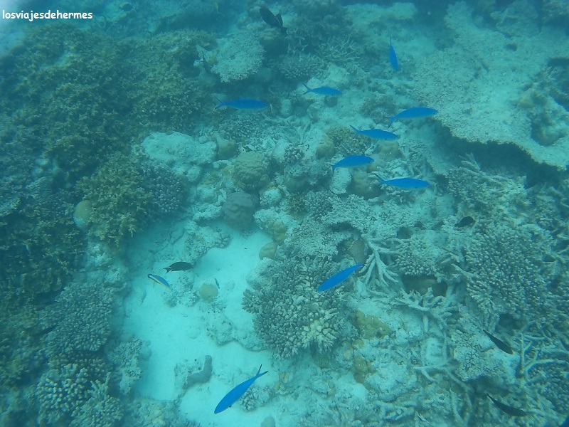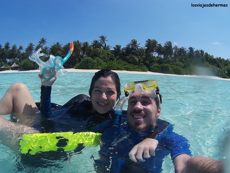 No nos aventuramos muy lejos por la fuerte corriente que además empujaba hacia fuera, pero con cuidado llegamos al borde del arrecife y a una zona llena de vida con bancos de peces de todos los colores y de lo más bonito. Intercalamos ratos de buceo con descansos en la arena y en la orilla, disfrutando a tope de la mañana y olvidándonos del resto del mundo, una maravilla la verdad. De regreso en el pueblo comimos por segundo día en el restaurante local, esta vez noodles y sin picante, todo muy bueno de nuevo, cobrándonos más que el día anterior (325 MVR=19,82 € por pareja) porque hubo pastel de postre.