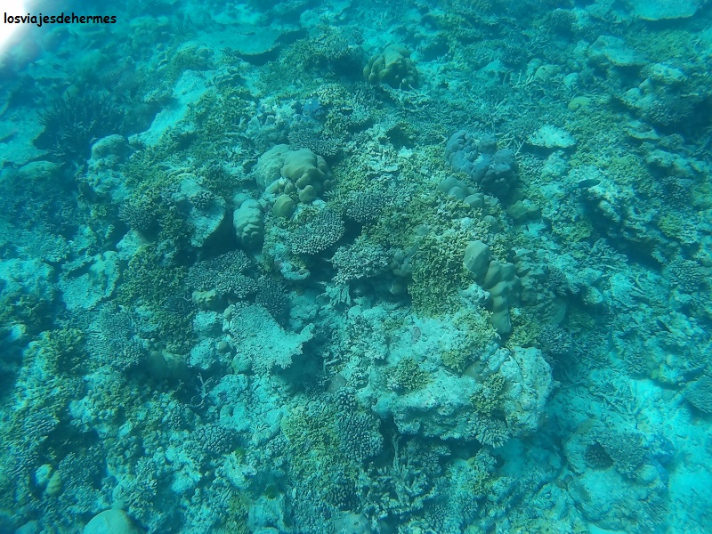 Felices con el desayuno nos fuimos directamente al agua para bucear en la pared del arrecife siguiendo el recorrido a favor de la corriente que Jose nos había recomendado, entrando por un canal despejado de coral y muy visible desde la playa más cercana al hotel, que no es bikini beach, si bien con una camiseta de agua para ellas fue suficiente, saliendo después por otro canal, no tan claro el primero, cerca de donde empezaba la bikini beach. Entre un punto y otro se va en la dirección de la corriente y en la zona donde el arrecife se pierde de vista en la profundidad, que sin duda es una de las que más vida tiene y donde más posibilidades hay de ver animales grandes, como así fue, pues nada más llegar a la pared nos recibió un águila de mar con su majestuoso vuelo acuático, disfrutando después de los clásicos peces loro, unicornio y muchos más cuyos nombres desconozco (no es que sólo hubiera loros y unicornios. Algún pequeño tiburón de puntas negras se dejó ver también en la segunda pasada que dimos.
