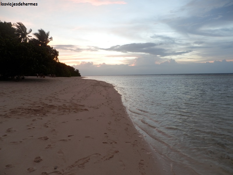 Con todas estas emociones nos fuimos a la bikini beach de la isla, bien señalizada y muy amplia, junto a la zona de selva de la isla, todo un paraíso de aguas totalmente cristalinas con la vegetación llegando casi hasta la orilla, buceando en el cercano y precioso arrecife que rodea la isla y notando, eso sí, una corriente más bien fuerte con la que conviene jugar a favor como Jose nos explicaría bien después. Una tortuga y una raya se dejaron ver aparte de las casi infinitas especies de peces tropicales que abundan por doquier. Con la inolvidable imagen del atardecer desde la misma playa, pues tiene orientación oeste-suroeste, volvimos a asearnos y cenar en el elegante buffet que el hotel tiene en la playa para los días de buen tiempo, con comida de sobra y ¡una mesa entera de postres! 😛 , todo por 15 $=14,34 € ó 243 MVR por persona (pagamos en Rufiyaas 486 MVR por los dos) y como os podéis imaginar la atención del personal inigualable.