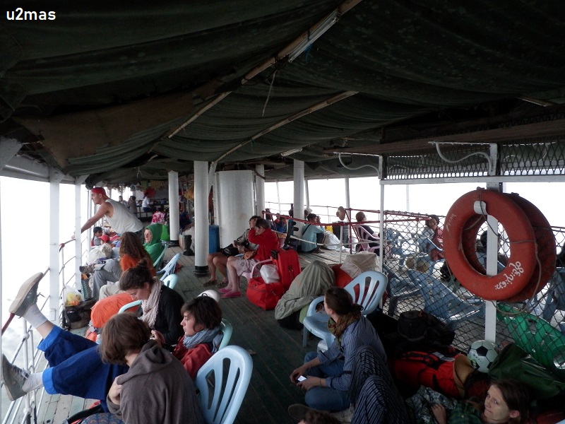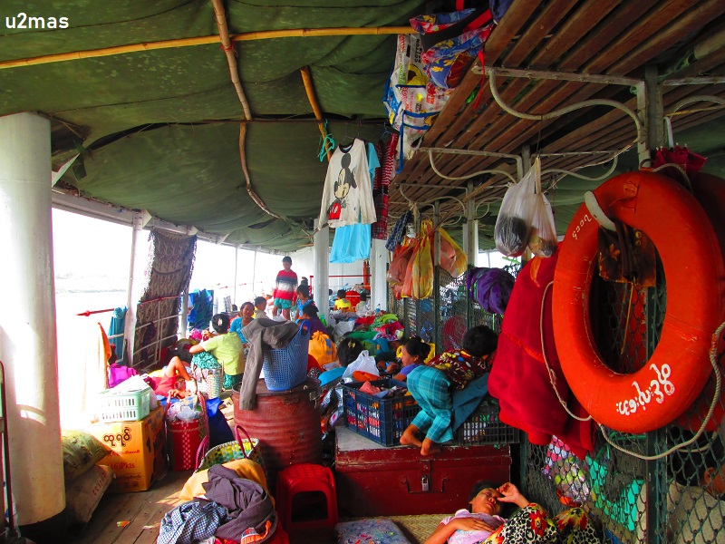 Después de un paseo para familiarizarme con la embarcación puedo decir que superó mis expectativas, estaba razonablemente limpio, las máquinas a la vista y pintadas, chalecos salvavidas suficientes y no iba sobrecargado. En la cubierta baja y acomodados en el propio suelo iban los birmanos con mercancías y equipajes variados, mientras que los turistas lo hacíamos en la cubierta superior con sillas de plástico a nuestra disposición (evidentemente, no pagaríamos lo mismo). En cualquier caso, había libertad total de movimiento por el barco, que tenía un restaurante a popa bastante decente para comprar comida y bebida y un par de baños, que resumiendo eran un agujero directo al agua.