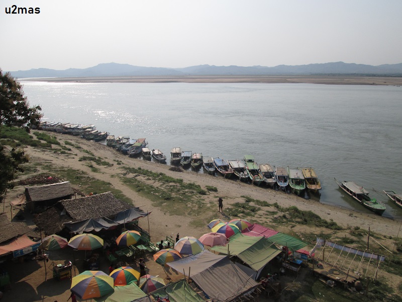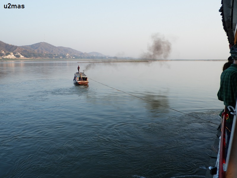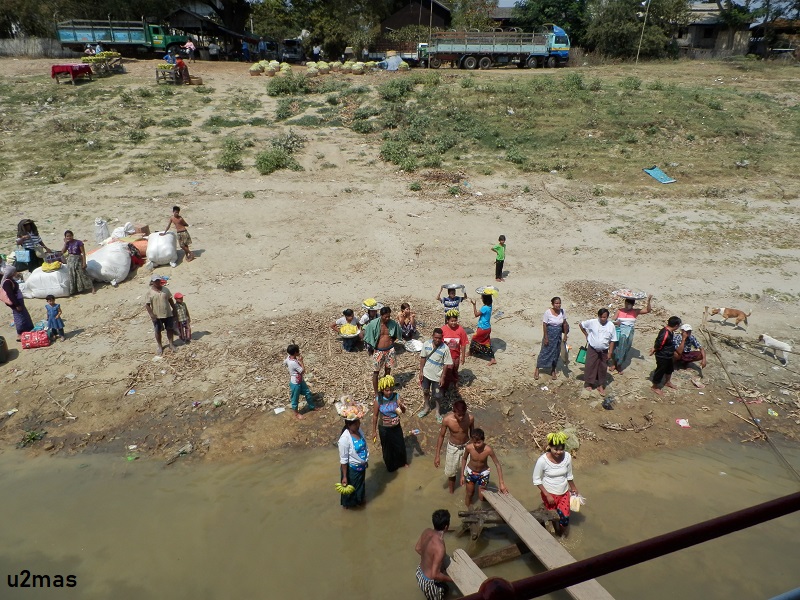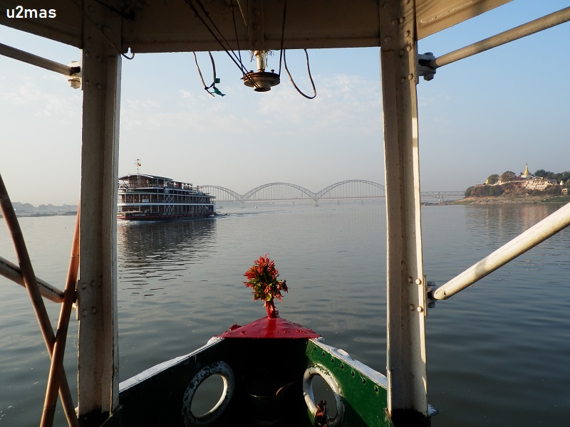 El recorrido fue agradable y caluroso, pasando como punto destacado frente a la colina de Sagain y bajo los puentes que cruzamos el día anterior en moto. Bien es cierto que el resto del paisaje que pudimos observar, mientras navegamos por el río Ayeyarwady, no tuvo mucho de especial, pero sí el ajetreo de la vida local en las aldeas y villas por las que pasa y donde va parando, con trasiego de pasajeros y mercancías. En dichas paradas también hay vendedores que ofrecen comida, aprovechando una de ellas para comprar unas somozas y plátanos, que junto al arroz del barco fue la comida por 3.000 MMK=2,57 € todo. Durante el viaje conocimos a otros viajeros como Isabel y Philipa, una española y alemana con las que coincidiríamos en Bagan.