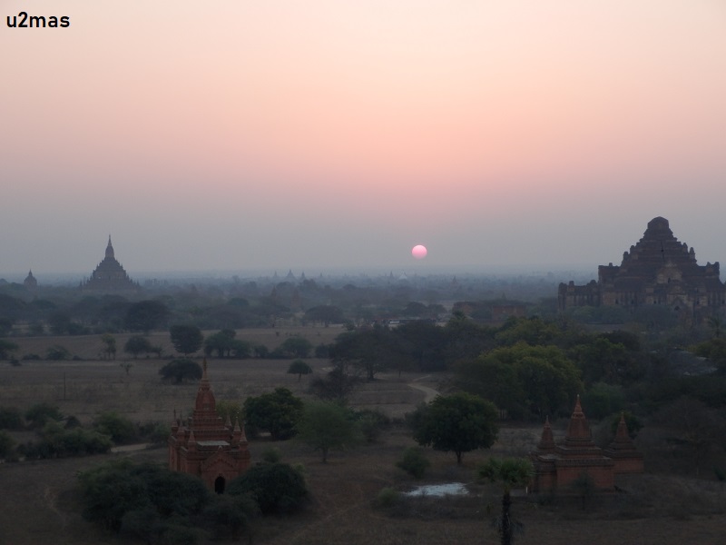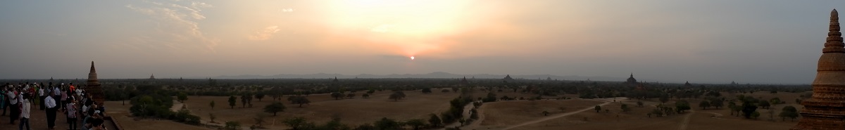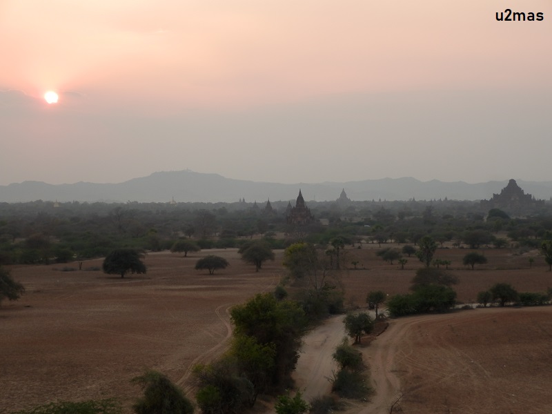 Con el sol cayendo, nos dirigimos hacia el este siguiendo los consejos del camarero, que apuntó la Pya-tha-da Pagoda como un buen punto de observación (también se puede subir), ya casi en el centro de la llanura, más próximo a la carretera New bagan-aeropuerto. Con bastante gente, pero sin agobios, nos quedamos a ver los últimos rayos de sol, creando curiosos juegos de luces y sombras de los muchos templos y estupas que teníamos alrededor y como era habitual ya, con bruma. Iniciamos el regreso casi de noche, con precaución, observando la iluminación de la Ananda Pagoda y llegando a tiempo de cenar en el restaurante junto al alojamiento, del mismo nombre.