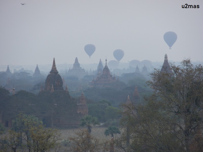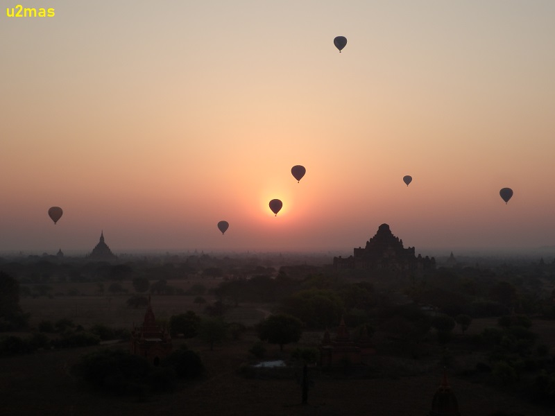 A las 5 de la mañana ya teníamos la bici de nuevo (ya estaban abiertos los locales de alquiler), para llegar con tiempo al Shew-san-daw Paya, a unos 5 kms, lugar elegido para ver el amanecer. Había bastante gente de nuevo, pero sin problemas, sentándonos orientados al este para ver como el sol iba iluminando las pagodas y las estupas, mientras los globos aerostáticos iban subiendo a la vez que mejoraban las fotos. Para quien le interese no le costará encontrar agencias donde contratar las salidas en globo, muy populares al amanecer.
