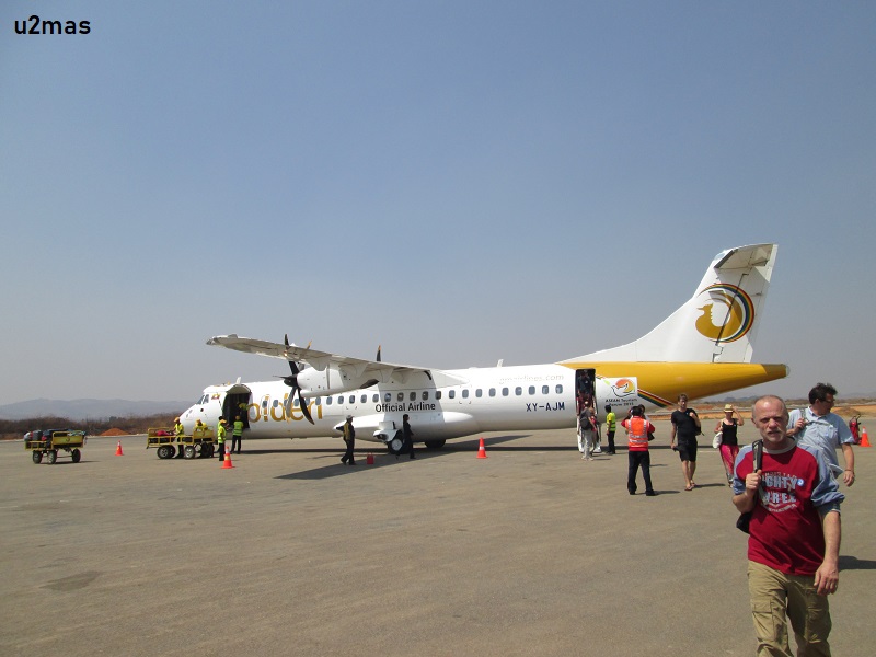 Como última contradicción, fuimos al aeropuerto para nuestro vuelo a Heho en un taxi de caballos, que tardó un buen rato en recorrer los 4 kms que lo separa del pueblo, pagando tras regatear 5.000 MMK=4,28 €. Prácticamente el aeropuerto abrió para el vuelo de Golden Myanmar, encargándose la propia tripulación de todo. El avión, de hélice, estaba como nuevo y el servicio a bordo durante los 40 minutos que duró el vuelo fue muy bueno, llegando a la hora prevista. Hacer constar que además de Golden Myanmar hay más aerolíneas para vuelos regionales que pueden ser útiles, como Air Mandalay o Air Bagan.