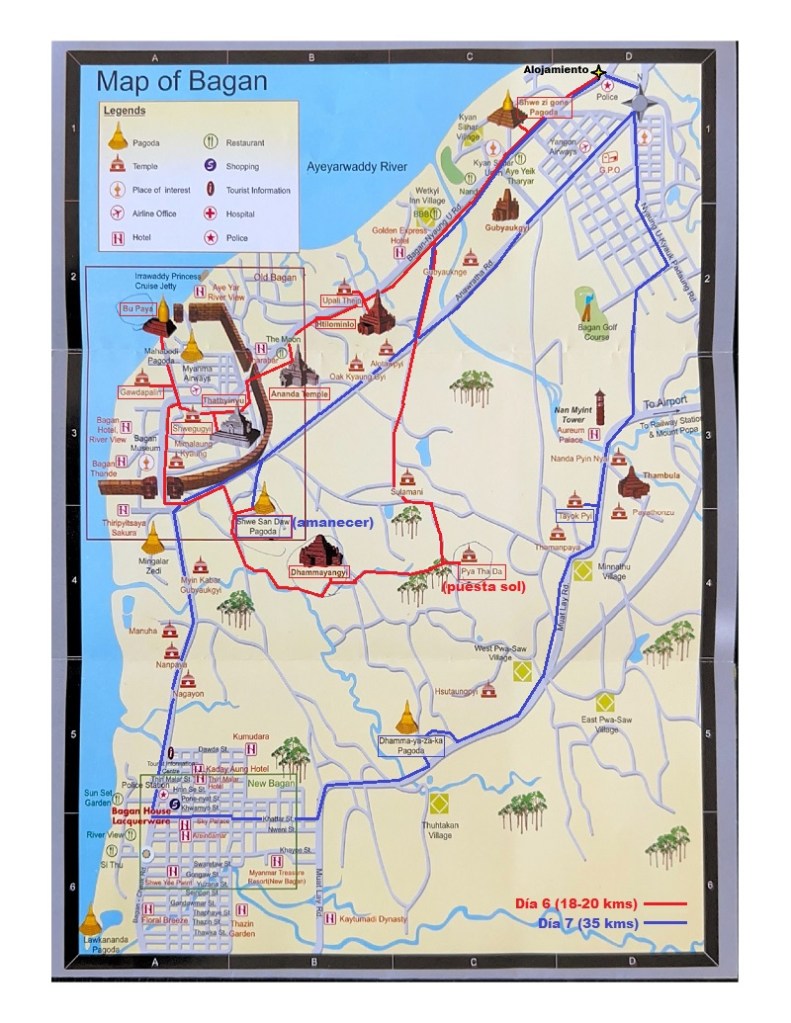 Con toda esta información decidimos hacer la visita en bicicleta, para lo cual es recomendable tener una forma física buena, llevar prenda de cabeza y agua suficiente, que salvo en los templos más alejados de los núcleos habitados, es fácil conseguir. Por supuesto, también hay opciones más cómodas y motorizadas para quien lo prefiera. Lo haríamos en 2 jornadas, una para la zona del Bagan Antiguo, donde se encuentran los templos más importantes, y otra para los más alejados (Bagan exterior).