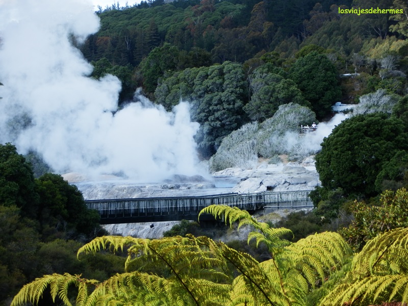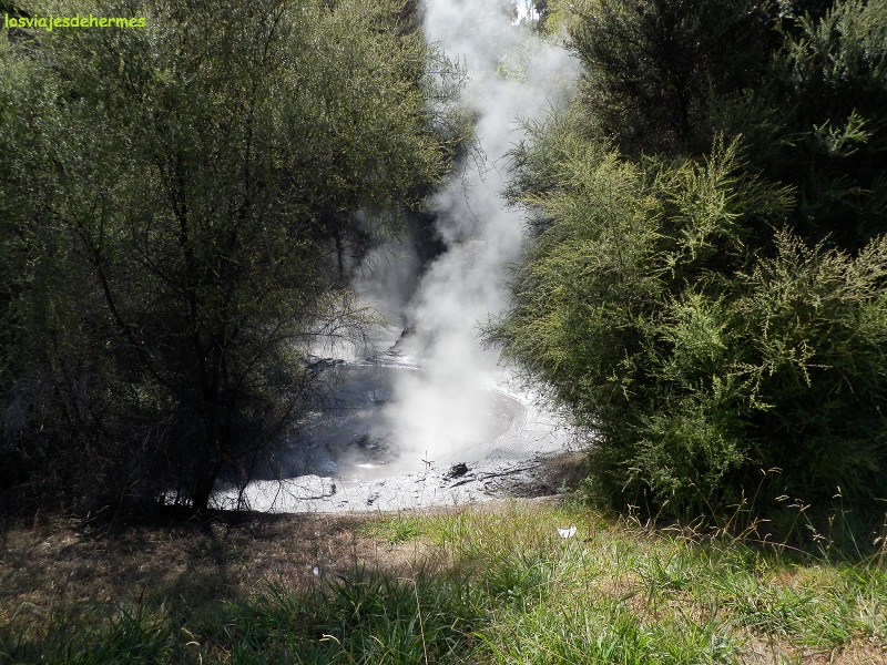 Aprovechando que el check-in era más tarde me fui a pasear por el contiguo parque Kuirau (de acceso libre), donde uno de los grandes atractivos de esta localidad, la actividad geotermal, se manifiesta con claridad, pasando junto a charcos humeantes, lagunas de barro en ebullición y cruzando las pasarelas de lagos más grandes entre una niebla fantasmagórica y el olor a huevo podrido tan característico de estos ambientes. Durante la agradable caminata pude charlar con unos viajeros uruguayos y algunos locales, todos ellos muy amables con el turista, que como os dije en la introducción, es una opinión que los que allí trabajaban, como mi hermano, no compartían.