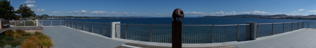 Relativamente temprano me puse en marcha para recorrer la primera etapa de este día, que me llevaría a Taupo, avanzando unos 50 kms por la carretera 5. Al igual que en trayectos anteriores los bosques frondosos se alternaban con grandes extensiones de granjas (ovejas por doquier), dejando también a un lado el parque geotermal de Wai-O-Tapu (el cual no visité ya que creo que debía ser similar a Te Puia). Pasado el pueblo de Wairakei la carretera 5 se une a la 1 pudiendo rodear Taupo si se desea o seguir en dirección a las cascadas de Huka, accediendo a la ciudad por Tongariro Street. Justo antes de entrar me detuve en un pintoresco mirador que permite hacerse una idea de la situación de la pequeña Taupo, que cuenta con unos 22.000 habitantes, a los pies del enorme lago del mismo nombre y que rellena la caldera de un volcán formado hace miles de años.