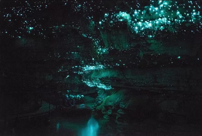 Una vez en el centro de visitantes de las cuevas de Waitomo, nos informamos de las diferentes opciones de entrada, eligiendo la combinada que permitía visitar la Glowworm cave y la Aranui cave (68 NZD=43,44 € por cabeza). Hacer constar que las visitas y actividades son algo caras en general en Nueva Zelanda y que prácticamente todo se puede pagar con tarjeta. La estrella de estas cuevas calizas es la Glowworm cave, o lo que es lo mismo “la cueva de los gusanos brillantes”, ya que cuenta con una peculiaridad que la hace mágica, convirtiendo la visita en inolvidable. Me estoy refiriendo a las larvas de luciérnagas que colman la parte superior de la cueva y que una vez que uno se acostumbra a la oscuridad comienzan a parpadear como si del cielo estrellado se tratara, llegando incluso a reflejarse en el agua, pues parte del recorrido por la misma, de unos 45 minutos con una temperatura constante de 15º C durante todo el año, se realiza en barca.
