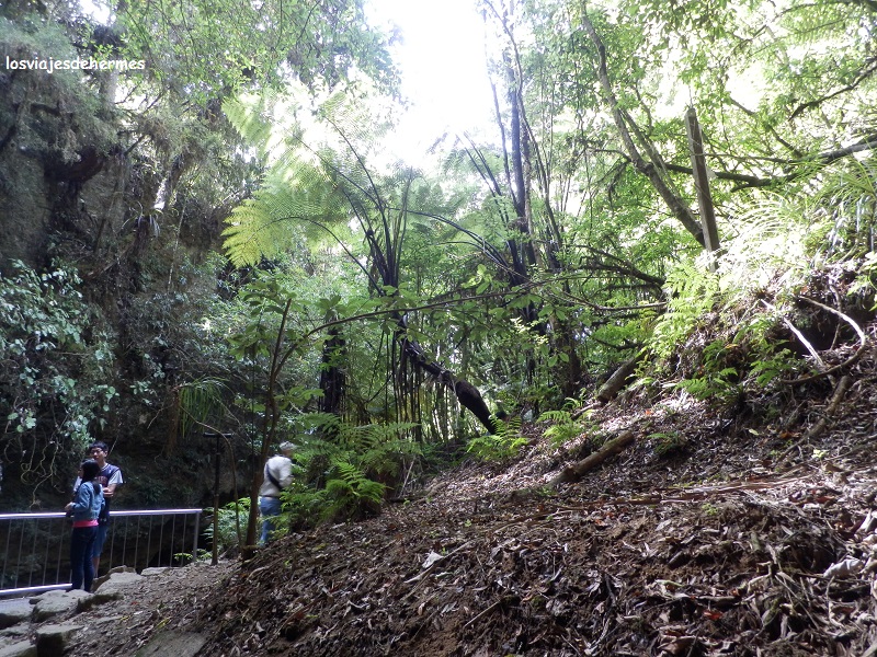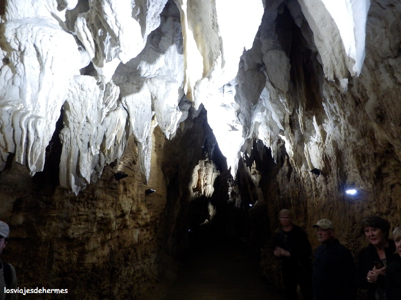 De vuelta a la superficie, cruzamos un primitivo bosque de musgos y helechos, planta que es símbolo del país, y fuimos a comer al pequeño restaurante del centro de visitantes, donde pagué 18 NZD=11,50 € por un sandwich de atún y un típico carrot cake (pastel de zanahoria) que la verdad estaba muy bueno. Para la tarde quedó la Aranui Cave, a 2,5 kms de la primera, que destaca por sus formaciones calizas de estalactitas y estalagmitas, es decir, una cueva más convencional y que tras la Glowworm cave me supo a poco, eso si el guía fue de lo más majo en los casi ¾ de hora que duró la visita, aquí con una temperatura de 12º C. La tercera cueva que ya no visitamos es la de Ruakuri, existiendo billetes combinados para las tres además de múltiples actividades de aventura (cosa habitual en todo el país) como rafting, os dejo este enlace para más información e imágenes, pues yo no pude obtener ninguna foto aceptable de los glowworms.
