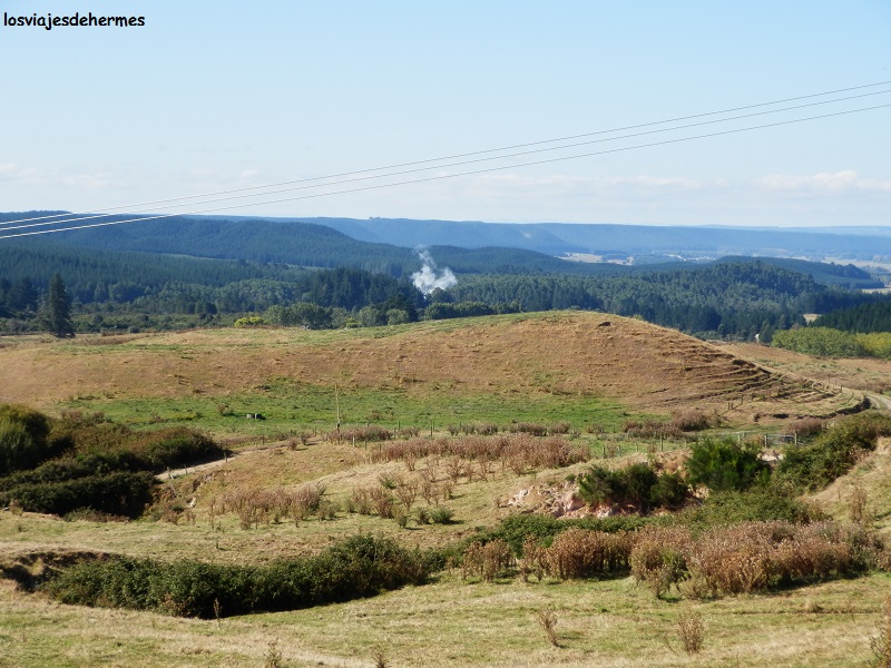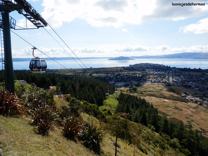 En pie y con todo recogido desayuné con total tranquilidad y tomé algunas notas antes de continuar mi marcha hacia Rotorua, cambiando de la ctra. 1 a la 5 pasada la localidad de Tirau y recorriendo los 60 ó 70 kms que me faltaban entre verdes campos abiertos y multitud de granjas. Muy poco antes de entrar en Rotorua y junto a la carretera está el teleférico Skyline, donde me detuve y por 25 NZD=15,97 € (ida y vuelta) ascendí en pocos minutos a un mirador de la ladera del Monte Ngongotaha, desde el cual había magníficas vistas tanto de la ciudad como del lago Rotorua. Además, en la estación superior se ofrecen actividades diversas como atracciones o karting en una pequeña pista.