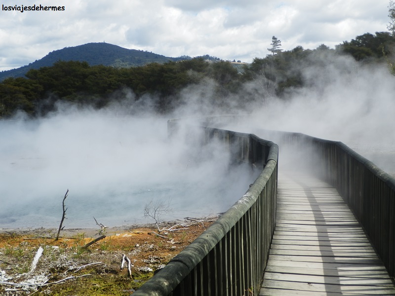 Aprovechando que el check-in era más tarde me fui a pasear por el contiguo parque Kuirau (de acceso libre), donde uno de los grandes atractivos de esta localidad, la actividad geotermal, se manifiesta con claridad, pasando junto a charcos humeantes, lagunas de barro en ebullición y cruzando las pasarelas de lagos más grandes entre una niebla fantasmagórica y el olor a huevo podrido tan característico de estos ambientes. Durante la agradable caminata pude charlar con unos viajeros uruguayos y algunos locales, todos ellos muy amables con el turista, que como os dije en la introducción, es una opinión que los que allí trabajaban, como mi hermano, no compartían.