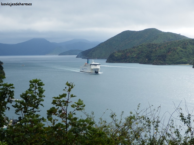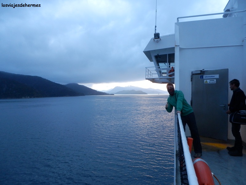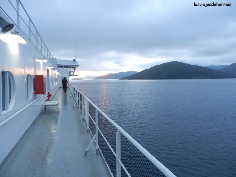 Puntuales estábamos navegando en el “Stena Allegra”, de la compañía Interislander(una vez más recuerdo el precio, 176 NZD=112,43 €) con viento fuerte y algo de marejada, al menos el tiempo que el buque quedó expuesto en el estrecho de Cook que separa ambas islas, pues en unas dos horas se llega al resguardo del Tory Channel y se continúa navegando entre los fiordos de Marlborough Sound (el viaje en total son unas 3 horas). Bien sabéis ya que yo es embarcar y -nunca mejor dicho- sentirme como pez en el agua, disfrutando de la navegación pese a la densa nubosidad, oscuridad, fuerte viento e incluso algo de lluvia, tiene su encanto también, lo que no me impide admitir que despejado y con luz debe ser espectacular.