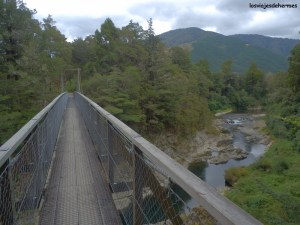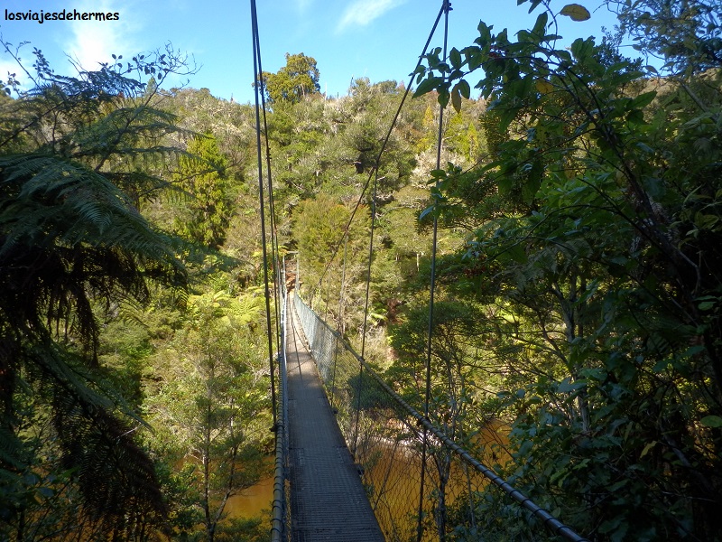 Poco antes de llegar se encuentra Cullen Point, un excelente mirador sobre una colina que se adentra en las estribaciones del fiordo Kenepuru y en el que existe un sendero que rodea el promontorio por la parte baja (me llevó 1 hora recorrerlo), pudiendo andar por las playas del fiordo al estar la marea baja y cruzando áreas densas de vegetación con los helechos, la planta más representativa del país, como estrellas principales. Comí allí tranquilamente reanudando la marcha hasta Havelock -donde la ruta se une a la carretera 6 dando por finalizada la Queen Charlotte drive- y avanzando otros 20 kms hasta la próxima y última parada importante del día, en el área del puente sobre el río Pelorus, que cuenta con un agradable paseo junto a sus limpias aguas, que de hacer mejor día hubiera invitado a bañarse, con puentes colgantes y zonas de descanso en los alrededores.
