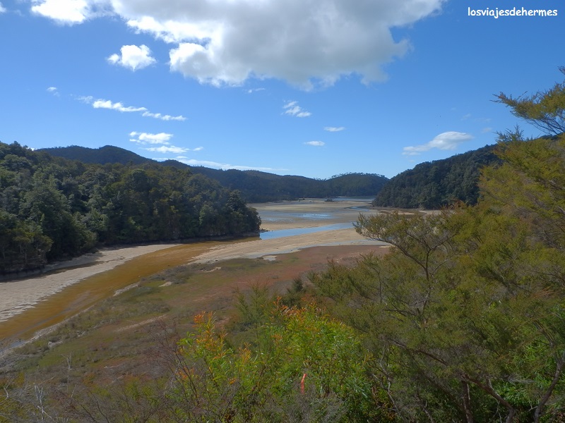 Las primeras fotos las hicimos en la próxima Bark Bay (a 10 minutos andando al norte), cuyo paisaje cambia significativamente en función de la marea, lo que es una circunstancia que se repite en otros puntos del parque. Tras ello anduvimos al sur hasta Torrent Bay (desde Medlands 6 kms y unas 2 horas) cruzando preciosos puentes colgantes que sorteaban la complicada orografía, que no de la ruta, pues pese a existir desniveles es de una exigencia mucho menor que la Tongariro Alpine Crossing. Allí comimos de nuestras provisiones (importante llevarlas, pues no hay bares), nos defendimos de los mosquitos y nos dimos un baño en las frías aguas de la bahía. Rodear Torrent Bay nos llevaría casi otras 2 horas, tiempo que se puede reducir mucho, hasta 50 minutos, si hay marea baja y se atraviesa la playa, si bien igualmente (aunque al estar alta no había elección) hubiéramos preferido seguir por el bosque.