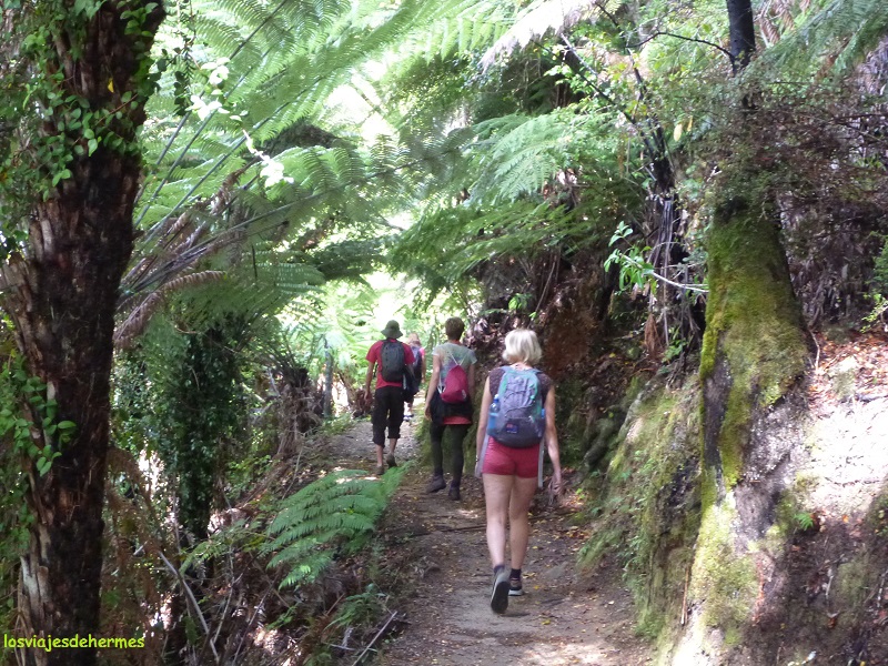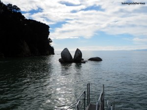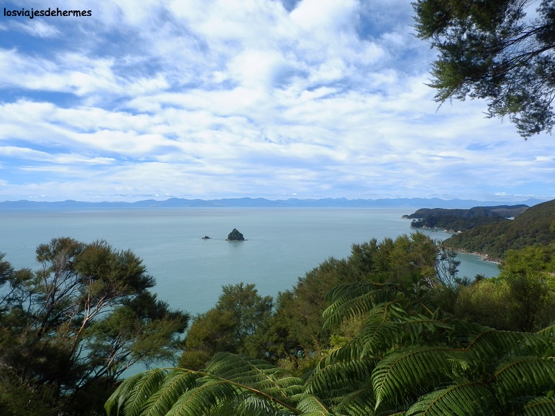 El sistema es sencillo, hay 4 horarios posibles de salida, siendo la nuestra 10:30 de la mañana, y otros tantos de regreso (la previsión era el de las 15:45 de la tarde), pudiendo combinar uno u otro, así como los diferentes puntos de embarque y desembarque. Nosotros a la ida bajaríamos en Medlands Bay y lo cogeríamos en Anchorage a la vuelta. Con todo claro nos hicimos a la mar en la tranquila bahía de Abel Tasman, pasando por la característica roca partida antes de llegar a Marahau y navegando sobre 1 hora con magníficas vistas de las playas y los bosques que llegaban a la misma orilla. Tras las paradas intermedias de Apple Tree Bay y Anchorage llegamos a Medlands Bay, punto de inicio de nuestra ruta de 11,5 kms a pie de vuelta a Anchorage, no tardando en adentrarnos en los bosques prehistóricos y primitivos llenos de helechos, con claros y miradores que nos permitían ver el mar y las playas más próximas, todo un espectáculo.