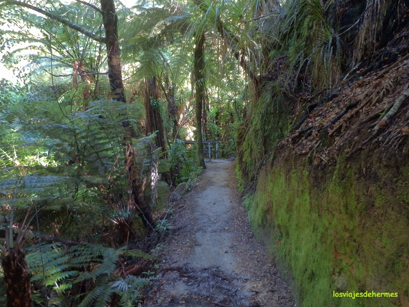 El día era bastante desapacible con nubes cerradas y lluvia ligera e intermitente, lo que por una parte le daba un halo de misterio, pero por contra impedía disfrutarlo al máximo. Pasada la bahía de Okiwa el fiordo queda atrás y la carretera pasa a ser recta por unos kilómetros hasta llegar al siguiente, el de Kenepuru. En cualquier caso, antes de llegar al mismo, a la altura del diminuto asentamiento de Linkwater, cogí el desvío a la Kenepuru Road que va bordeando el fiordo hacia el norte, llegando hasta la población de Te Mahia (21 kms de Picton a Linkwater y otros 20 hasta Te Mahia). El camino se me hizo ameno, contemplando lo colorido del paisaje y charlando con dos autoestopistas alemanas a las que acerqué al pueblo, deteniéndome después a la salida de este para hacer un pequeño trayecto de la famosa ruta Queen Charlotte Track.