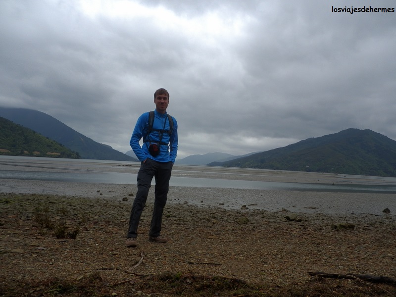 El día era bastante desapacible con nubes cerradas y lluvia ligera e intermitente, lo que por una parte le daba un halo de misterio, pero por contra impedía disfrutarlo al máximo. Pasada la bahía de Okiwa el fiordo queda atrás y la carretera pasa a ser recta por unos kilómetros hasta llegar al siguiente, el de Kenepuru. En cualquier caso, antes de llegar al mismo, a la altura del diminuto asentamiento de Linkwater, cogí el desvío a la Kenepuru Road que va bordeando el fiordo hacia el norte, llegando hasta la población de Te Mahia (21 kms de Picton a Linkwater y otros 20 hasta Te Mahia). El camino se me hizo ameno, contemplando lo colorido del paisaje y charlando con dos autoestopistas alemanas a las que acerqué al pueblo, deteniéndome después a la salida de este para hacer un pequeño trayecto de la famosa ruta Queen Charlotte Track.