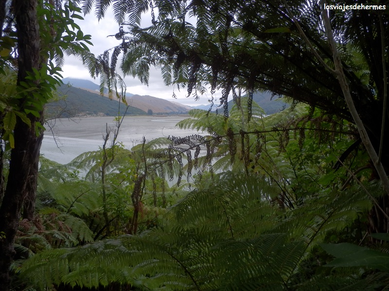 Poco antes de llegar se encuentra Cullen Point, un excelente mirador sobre una colina que se adentra en las estribaciones del fiordo Kenepuru y en el que existe un sendero que rodea el promontorio por la parte baja (me llevó 1 hora recorrerlo), pudiendo andar por las playas del fiordo al estar la marea baja y cruzando áreas densas de vegetación con los helechos, la planta más representativa del país, como estrellas principales. Comí allí tranquilamente reanudando la marcha hasta Havelock -donde la ruta se une a la carretera 6 dando por finalizada la Queen Charlotte drive- y avanzando otros 20 kms hasta la próxima y última parada importante del día, en el área del puente sobre el río Pelorus, que cuenta con un agradable paseo junto a sus limpias aguas, que de hacer mejor día hubiera invitado a bañarse, con puentes colgantes y zonas de descanso en los alrededores.
