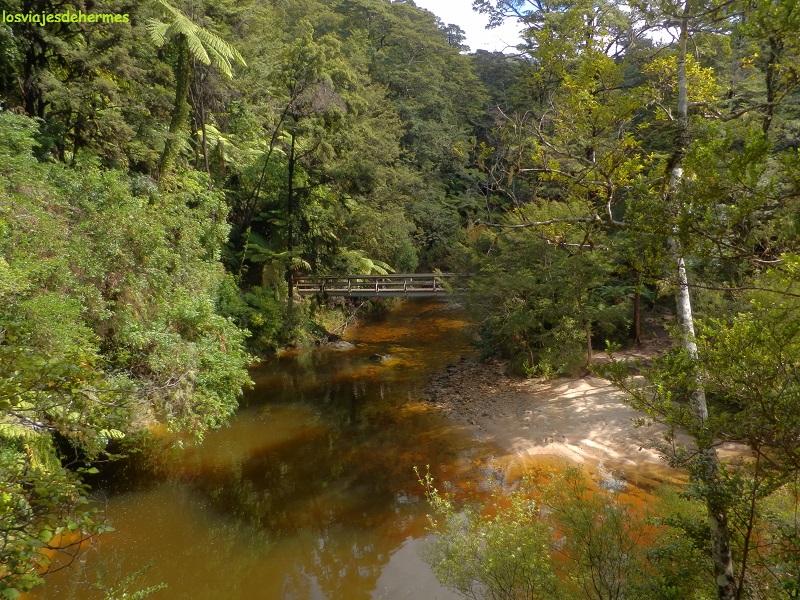 Las primeras fotos las hicimos en la próxima Bark Bay (a 10 minutos andando al norte), cuyo paisaje cambia significativamente en función de la marea, lo que es una circunstancia que se repite en otros puntos del parque. Tras ello anduvimos al sur hasta Torrent Bay (desde Medlands 6 kms y unas 2 horas) cruzando preciosos puentes colgantes que sorteaban la complicada orografía, que no de la ruta, pues pese a existir desniveles es de una exigencia mucho menor que la Tongariro Alpine Crossing. Allí comimos de nuestras provisiones (importante llevarlas, pues no hay bares), nos defendimos de los mosquitos y nos dimos un baño en las frías aguas de la bahía. Rodear Torrent Bay nos llevaría casi otras 2 horas, tiempo que se puede reducir mucho, hasta 50 minutos, si hay marea baja y se atraviesa la playa, si bien igualmente (aunque al estar alta no había elección) hubiéramos preferido seguir por el bosque.