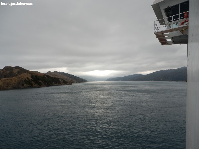 Puntuales estábamos navegando en el “Stena Allegra”, de la compañía Interislander(una vez más recuerdo el precio, 176 NZD=112,43 €) con viento fuerte y algo de marejada, al menos el tiempo que el buque quedó expuesto en el estrecho de Cook que separa ambas islas, pues en unas dos horas se llega al resguardo del Tory Channel y se continúa navegando entre los fiordos de Marlborough Sound (el viaje en total son unas 3 horas). Bien sabéis ya que yo es embarcar y -nunca mejor dicho- sentirme como pez en el agua, disfrutando de la navegación pese a la densa nubosidad, oscuridad, fuerte viento e incluso algo de lluvia, tiene su encanto también, lo que no me impide admitir que despejado y con luz debe ser espectacular.