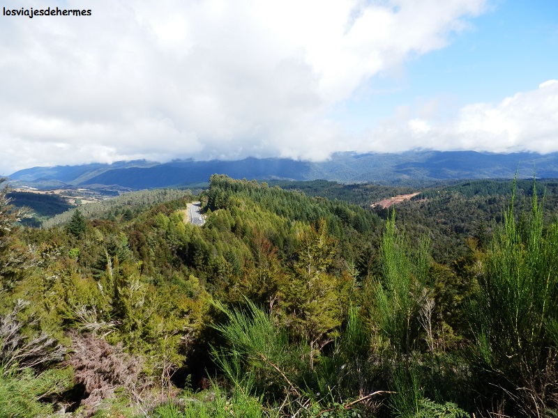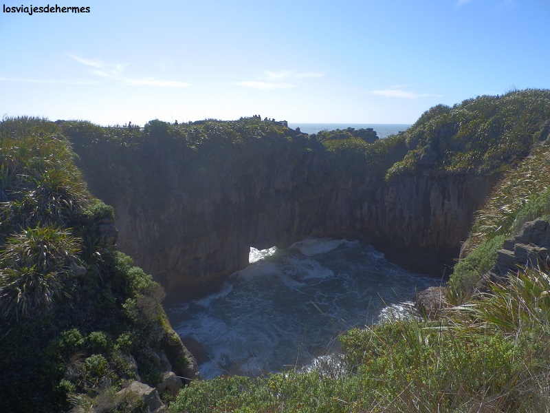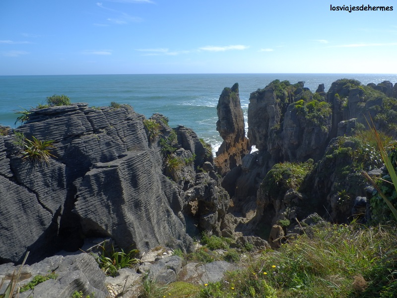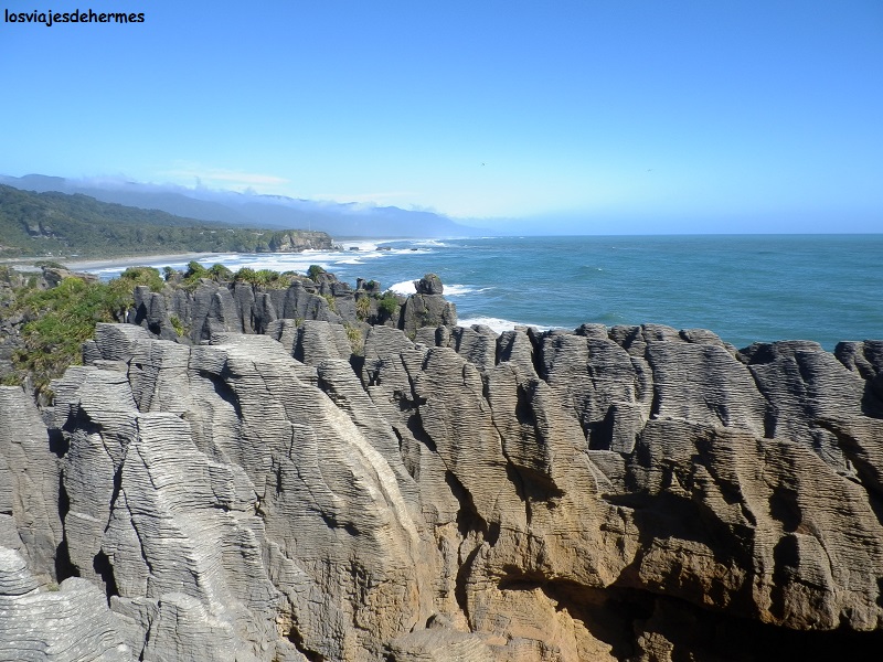Avanzaríamos unos 190 kms por los habituales paisajes neozelandeses, muy coloridos, montañosos y con muchas salidas a áreas de descanso con merenderos -parando un par de veces- antes de llegar a Inangahua, donde existe la posibilidad de ahorrarse unos kilómetros por las carreteras 69 y 7 que enlazan con la costa a la altura de Greymouth, cosa que no pretendíamos ya que en la carretera 6 y antes de la mencionada localidad visitaríamos la mejor atracción del día, las formaciones rocosas de Punakaiki. Comimos de nuestros víveres, dando las últimas curvas para salir de las montañas y llegar al nivel del mar en Charleston, cruzando a partir de ahí las estribaciones del Paparoa National Park en el que se ubica Punakaiki (90 kms desde Inangahua). También conocidas como las “Pancake Rocks”, esta curiosa y particular formación caliza bien merece una parada, existiendo para ello un sendero habilitado que las recorre con vistas a las capas que se han formado en las propias rocas y a los múltiples orificios por donde entra el agua del mar, tardando con calma no más de 1 hora en la visita.
