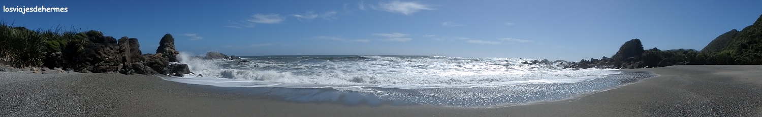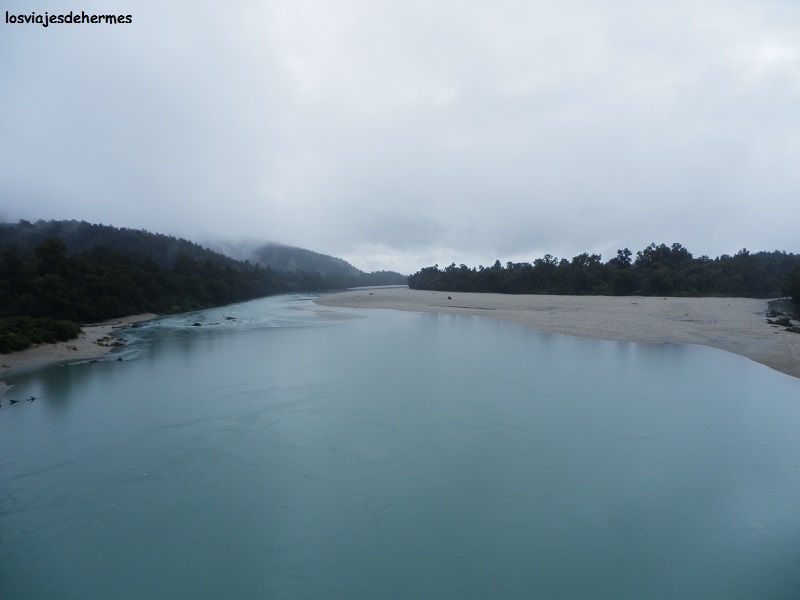 Continuamos la marcha por la carretera 6 bajo un cielo muy cambiante entre sol, nubes e incluso alguna gota, arribando a la localidad de Greymouth después de 45 kms desde las rocas con interesantes tramos pegados a la orilla del Océano Pacífico. Tanto esta población como Hokitika (siguiente pausa, separadas por 39 kms) no llamaron nuestra atención especialmente, al menos en la segunda dimos un breve paseo por su playa además de comprar comida en un supermercado “New World”. Todavía quedaba un extenso tramo de 130 kms por cubrir, en el que la carretera 6 se aleja un poco del mar, para ascender y transcurrir por las faldas occidentales de las montañas del Aoraki/Mt.Cook National Park, zona en la que desembocan las glaciares más famosos y visitables, como al que nos dirigíamos o el de Fox.