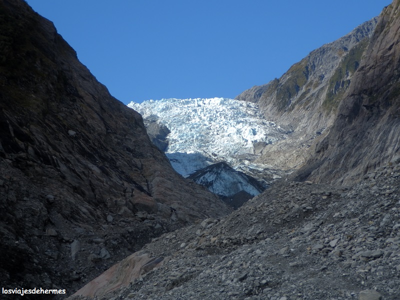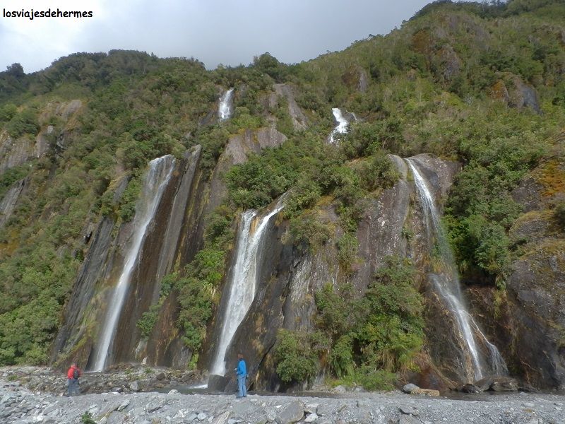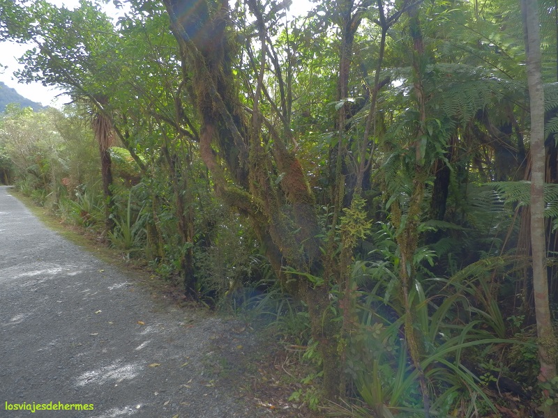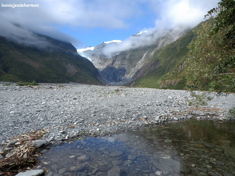 Con la idea de acercarnos al glaciar Franz Josef lo más posible, salimos del pueblo girando a la izquierda nada más cruzar el puente sobre el río Waiho, llegando al parking tras 4 kms. Desde ahí existe una ruta que, tras cruzar una parte con vegetación frondosa, los llamados “rainforest”, se abre al valle y sube a la vera del río hasta el punto de observación de la lengua del glaciar, que como es habitual -y mala noticia- está en retroceso. El paseo puede llevar 2 horas entre ida y vuelta, en las que se pasa por cascadas y se obtienen magníficas vistas tanto del frontal del glaciar como de las montañas que forman el valle del río Waiho.