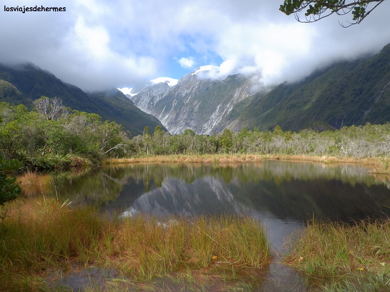 De vuelta al parking nos fuimos por otro pequeño sendero señalizado en busca de la Peter`s Pool, un lago en el que las montañas se reflejan provocando un efecto de espejo, vista de la que disfrutamos ayudados del buen tiempo que hacía en ese momento (entre ida y vuelta 40 minutos). La mañana resultó de lo más agradable y estuvo bien aprovechada, quedando tiempo para regresar al hostal a hacerme la comida y despedirnos (si bien comprobamos que nuestras rutas volverían a coincidir en Christchurch en una semana), pues Daniela se quedaba en la zona realizando otras actividades -que como en cualquier área natural del país son muy amplias, incluyendo aquí vuelos en helicóptero o paseos por el glaciar-, mientras que yo partía hacia Wanaka teniendo 285 kms por delante.