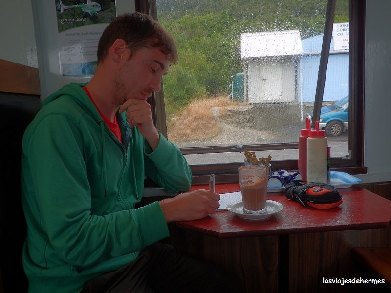 El tiempo empeoró, pese a lo que el recorrido -en mi opinión- mereció la pena, cruzando varios puentes entre los que destacaron el del estuario Hapuka y el del río Arawhata, además existe la posibilidad de ver pingüinos (no tuve suerte) y rutas de senderismo por doquier. Jackson Bay es un tranquilísimo, aislado y diminuto pueblo de pescadores, situado en el que está considerado como único refugio natural de la costa oeste, apenas me crucé con gente, pero al menos el único bar restaurante de la zona, la caravana “Cray pot”, estaba abierto, pidiendo allí un chocolate (5 NZD=3,19 €) mientras aprovechaba para tomar notas, sin duda el lugar me gustó y me inspiró pese a la lluvia, que por otra parte le daba un toque especial. De haber hecho mejor tiempo me habría animado a realizar alguna de las rutas cortas (de una media hora) a pie que hay hasta las playas del otro lado de la bahía.