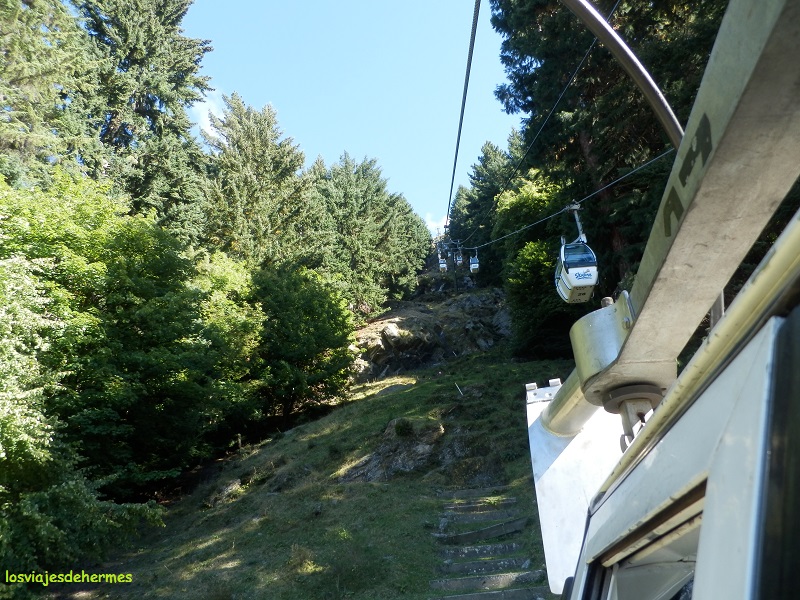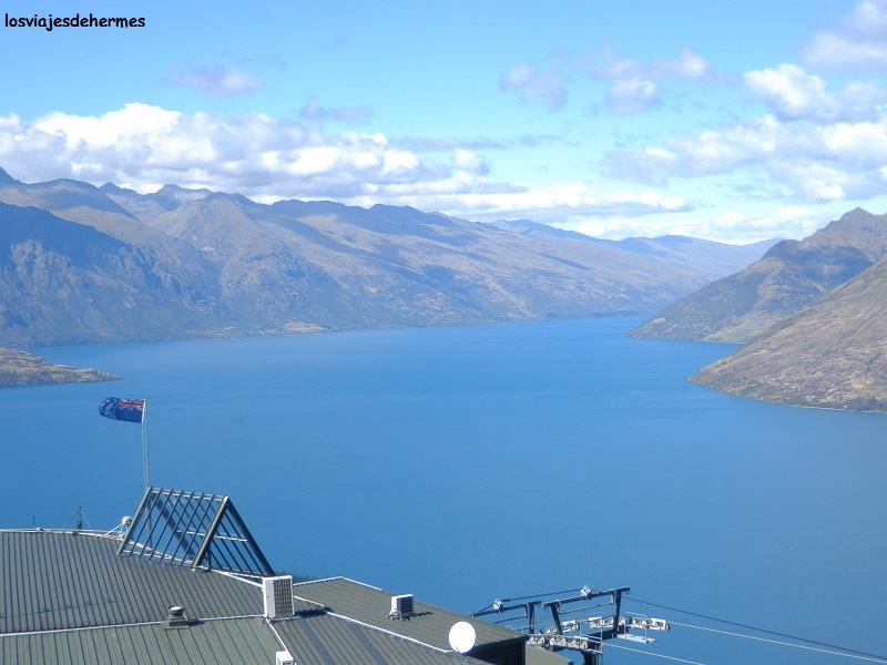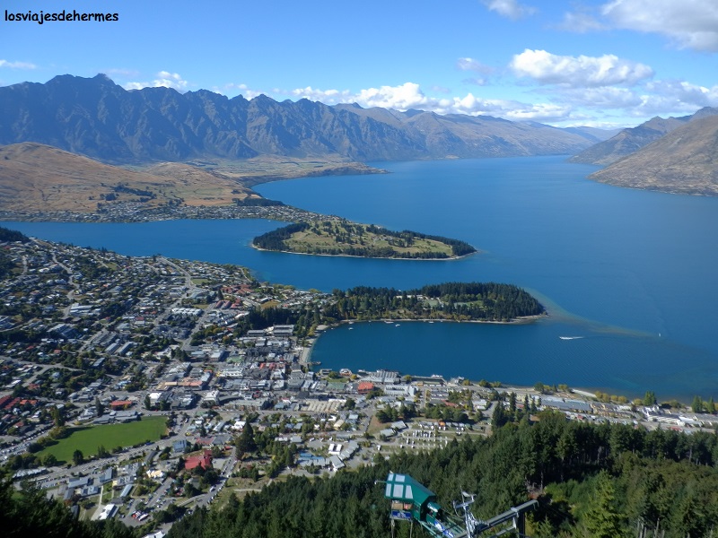 Por la ruta principal se recorre ¼ de la distancia ya mencionada para llegar a Queenstown, ciudad de 15.000 habitantes donde es realmente difícil aburrirse, si bien es cierto que si se opta por las múltiples actividades de aventura disponibles -como puenting, rafting o vuelos escénicos- habrá que preparar un buen puñado de dólares. Los operadores turísticos y puntos de información son abundantes en cuanto se llega al centro, dirigiéndome al teleférico skyline como primera opción (cuesta 27 NZD=17,24 € ida y vuelta, existiendo la posibilidad de subir andando). En pocos minutos se llega a la cima del Bob`s Peak, cuya panorámica es espectacular, con la ciudad a los pies, el lago Wakatipu con su forma de “S” y su color azul intenso dominando la escena, así como montañas de fondo en todas direcciones.