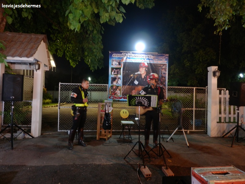 Después de asearnos y coincidiendo con que era domingo recorrimos el mercadillo “Sunday Walking Street”, es decir la calle Ratchadamnoen a tope de gente y puestos con todo tipo de artesanías, comida, actuaciones musicales (una de ellas de un policía con su uniforme que recaudaba fondos para los más necesitados), un paseo totalmente recomendable. Si no pudierais verlo siempre tendréis el Bazar nocturno (lo visitaríamos al día siguiente, está todos los días) y el de los sábados (Saturday Walking Street que está al sur de la ciudad antigua). Comimos unos pinchos y algo de comida japonesa en unos puestos de una plaza junto a la calle (120 THB=2,98 € los dos) y dimos varias vueltas con los ojos bien abiertos por la zona de artesanía (algo compramos también, claro) antes de irnos a descansar, cosa que nuestros pies ya pedían.