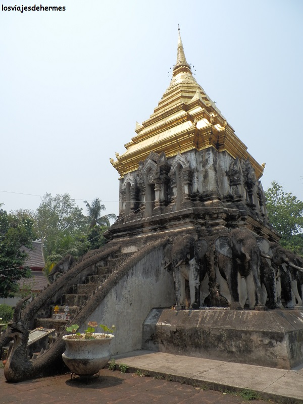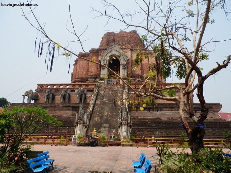 Seguidamente bajamos por la calle Phra Pokklao hasta cruzar de nuevo la principal (Ratchadamnoen) llegando a dos templos tan interesantes como diferentes, siendo el primero el Wat Phan Tao, un bonito templo construido en madera de teca con multitud de detalles (una vez más gratuito). Junto a este último se encuentra el Wat Chedi Luang, que tiene como mayor atractivo una enorme estupa que tuvo que ser reconstruida (también tiene elefantes en uno de sus niveles) y donde es posible charlar en inglés con monjes budistas de la comunidad en los edificios anexos más modernos, nosotros lo hicimos y pudimos compartir algunos comentarios y preguntas, sin duda una curiosa y positiva experiencia. No hay que pagar para entrar a este templo, pero al igual que en los anteriores un donativo será muy bien aceptado.
