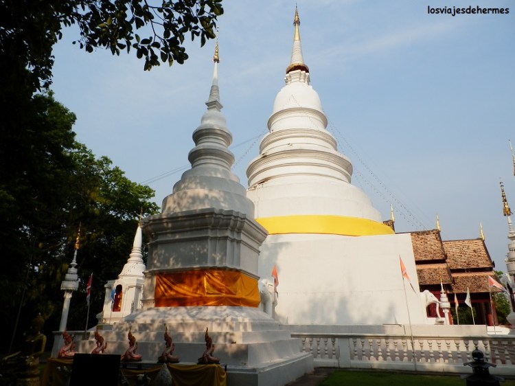 Continuamos dando un buen paseo para bajar la comida llegando al final de la calle y cogiendo a la izquierda la calle Suthep donde está la entrada a un templo más, el Wat Suan Dok, un bonito lugar con una gran estupa o “chedi” blanca acompañado de otras más pequeñas y del mismo color, además aquí y según un cartel que leímos era posible hacer cursos de meditación en inglés y había charlas con los monjes los lunes, miércoles y viernes por la tarde (ese día era martes y no fue posible, pero ya lo hicimos en el Wat Chedi Luang dos días antes). De allí regresamos al centro y al alojamiento en un taxi común por 20 THB=0,50 € cada uno, saliendo ya más tarde para cenar y pasear por el animado mercado nocturno.