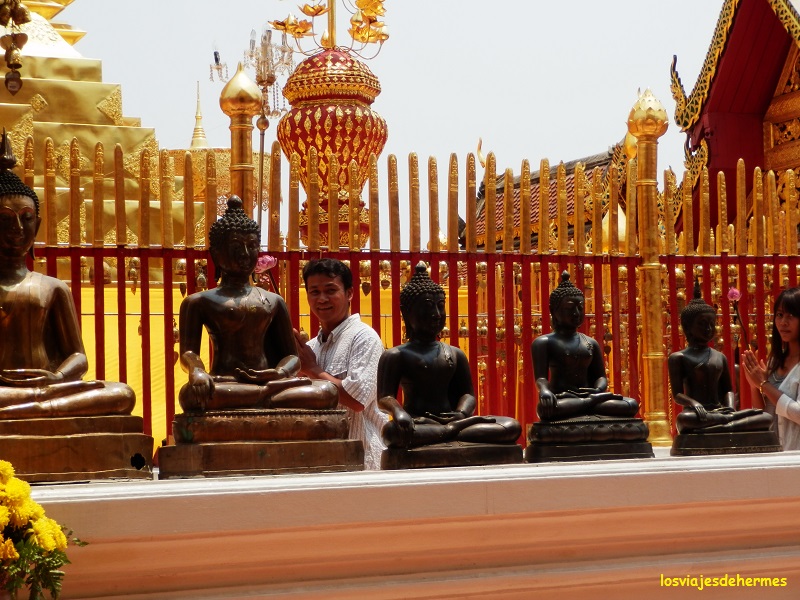Ya la larga escalera tiene multitud de detalles al igual que el resto del complejo, por lo que es muy recomendable ir sin prisas, la construcción principal es una imponente estupa dorada rodeada de más templos y santuarios con diferentes imágenes, pinturas, esculturas y todo con un ambiente mezclado de turistas y locales realizando oraciones u ofrendas, lo dicho, es para disfrutarlo. Lo único que debido a la bruma que hacía ese día (con mucho calor como de costumbre) no se alcanzaba a ver Chiang Mai desde un mirador que hay. Tras un buen rato deambulando por el templo y sentándonos a observar sin más bajamos a la carretera buscando la parada del taxi común esta vez, que nos costó 40 THB=0,99 € a cada uno, eso sí después de comprar agua y algo de fruta.
