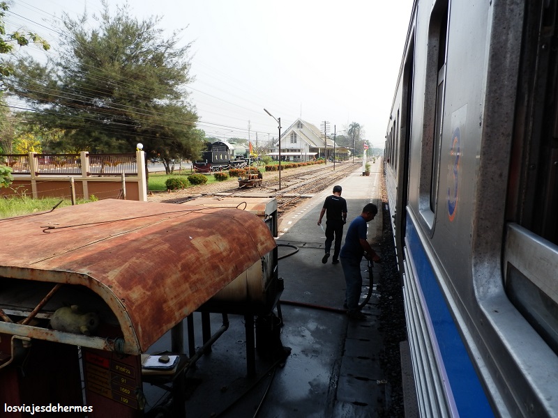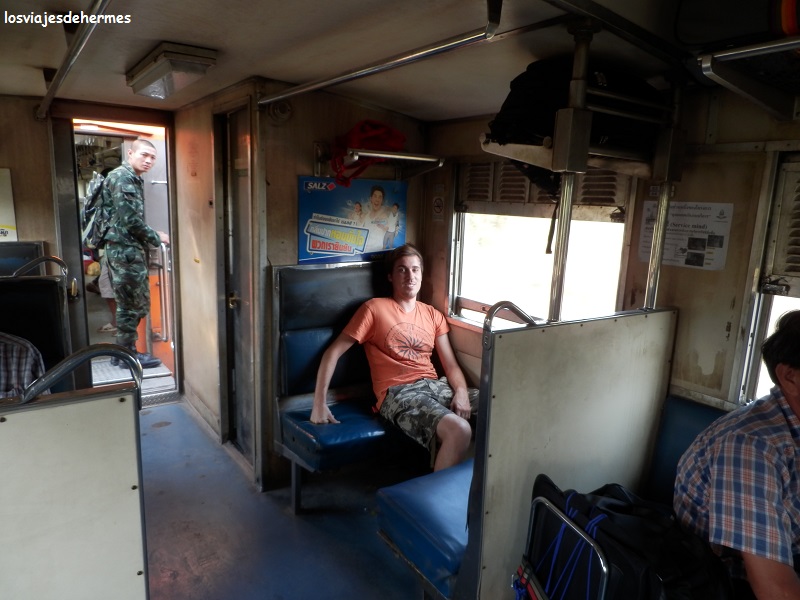 Para nuestra sorpresa el tren llegó sólo con 10 minutos de retraso, a las 7.40 (tuvimos tiempo de desayunar en el mercado), como ya dije nos atrevimos con la 3ª clase para un trayecto previsto de más de 7 horas que se alargó hasta las 10 horas y pico, casi nada, sin duda ninguna es toda una experiencia de las que se tachan de la lista una vez hechas, si volviera iría en 2ª clase como mínimo o de noche en tren-cama. Lo mejor de la 3ª clase es el precio de sólo 65 THB=1,61 € que es inmejorable, en cuanto al viaje los asientos de esta clase son más rígidos y menos confortables que en las demás, las ventanas van abiertas (no hay aire acondicionado), el ir y venir de vendedores (comida y bebida sobre todo) fue frecuente y el tren hizo varias paradas (una de ellas de hasta 30 minutos) para dejar pasar a otros convoyes con mayor prioridad.