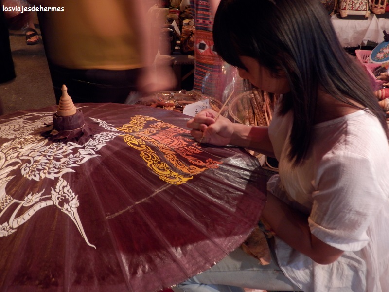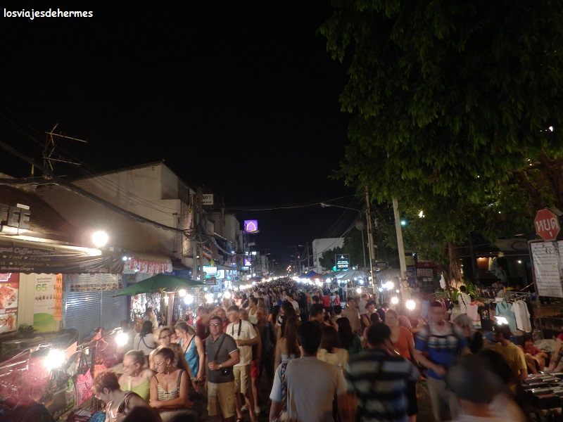 Regresamos a Chiang Mai llegando allí una hora antes de lo anunciado en el panfleto, a las 4 de la tarde, aprovechando para recoger la ropa que habíamos dejado en la lavandería enfrente del alojamiento a 25 THB=0,62 € el kilo de ropa (lavado y secado, pagando más también planchaban). Por la noche salimos a cenar por la zona, haciéndolo en un restaurante vegetariano (pagamos 225 THB=5,61 € por los dos) y como no a pasear para curiosear y bajar la comida al “night bazar”, el mercadillo más famoso de Chiang Mai. A diferencia del “Saturday o Suday walking street” este está montado todos los días y más o menos tiene las mismas cosas e incluso más variedad, si acaso en el del domingo me dio la sensación de que había más artesanías hechas a mano, pues en muchos puestos vimos cómo las hacían. Para llegar al bazar nocturno andamos por la calle Tha Phae (la que sale enfrente de la puerta del mismo nombre, pero en dirección opuesta a la ciudad antigua) y giramos a la derecha por la calle Chang Khlan que es donde empieza (unos 10 minutos a pie desde la puerta).