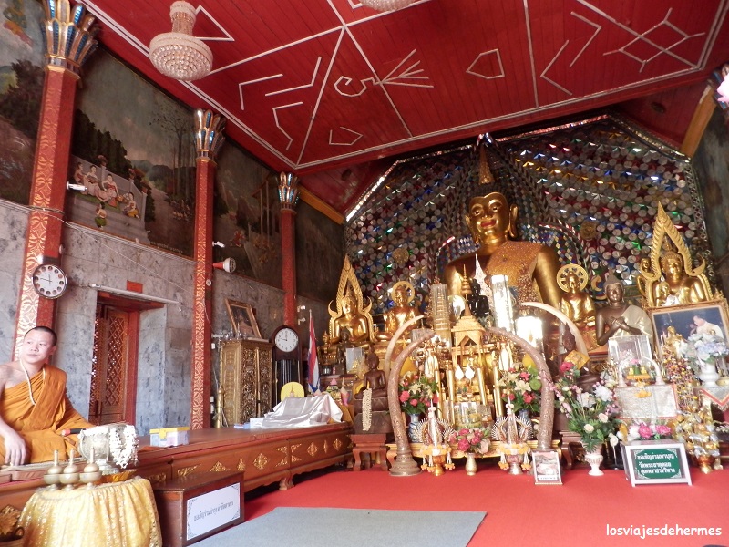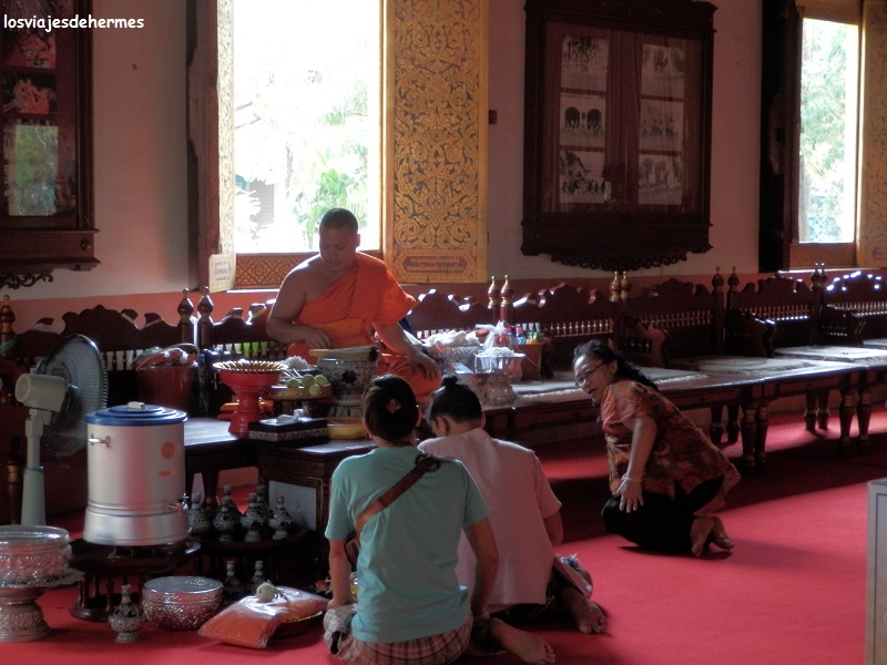 Seguidamente bajamos por la calle Phra Pokklao hasta cruzar de nuevo la principal (Ratchadamnoen) llegando a dos templos tan interesantes como diferentes, siendo el primero el Wat Phan Tao, un bonito templo construido en madera de teca con multitud de detalles (una vez más gratuito). Junto a este último se encuentra el Wat Chedi Luang, que tiene como mayor atractivo una enorme estupa que tuvo que ser reconstruida (también tiene elefantes en uno de sus niveles) y donde es posible charlar en inglés con monjes budistas de la comunidad en los edificios anexos más modernos, nosotros lo hicimos y pudimos compartir algunos comentarios y preguntas, sin duda una curiosa y positiva experiencia. No hay que pagar para entrar a este templo, pero al igual que en los anteriores un donativo será muy bien aceptado.
