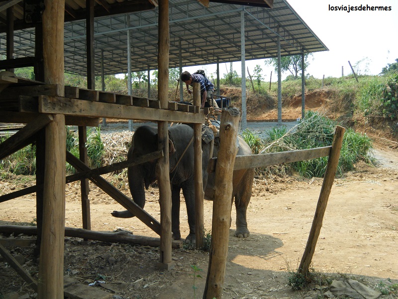 Nos levantamos pronto y a las 8.30 de la mañana vino una furgoneta a recogernos al hotel para la excursión, después a por cuatro chinos en otro hotel y ya estábamos todos. Nos pusimos en marcha hacia la zona de Mae Wang que está al sureste de Chiang Mai, tardando una hora en llegar a la primera actividad del día que además sería el plato fuerte, montar en elefante. Justo antes se subió el que sería nuestro guía, un chico joven que hablaba suficiente inglés, y nos dispusimos a subir en los elefantes gracias a una estructura de madera.