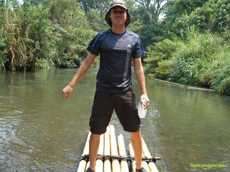 Tras el paseo nos dirigimos al punto de embarque del “bambú rafting”, que como su nombre indica era una balsa muy larga de bambú en la que descendimos un río. No fue especialmente excitante, si bien es cierto que el paisaje era bonito pudiendo disfrutar de ello ya que la balsa no iba muy rápido, además llevábamos un guía que gobernaba la balsa. La actividad ganó enteros cuando atravesamos un pueblo con casetas a ambos lados del río que fue muy curioso, si bien pudimos observar la vida diaria de la zona, el agua y el entorno estaban bastante sucios aquí. Acabamos el recorrimos y ya en la furgoneta llegamos a un mercadillo de una minoría étnica, la de los Karen, donde no se puede decir que hubiera mucha gente, dimos una vuelta viendo la artesanía que vendían y la visita se dio por concluida.