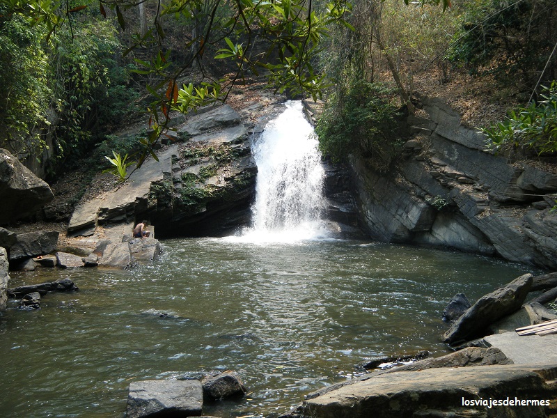 Para terminar la excursión anduvimos todo el grupo, con el guía a la cabeza hasta una cascada bastante bonita donde según la publicidad podríamos nadar. Los chinos no estaban interesados y al final el guía dijo que podíamos meternos al agua pero que teníamos poco tiempo, así que nosotros por lo menos nos dimos un chapuzón y nos refrescamos en un entorno difícil de igualar. He de confesar que esta excursión no es para nada la primera que me viene a la cabeza si recuerdo el viaje, y es que, aunque disfrutamos de experiencias como montar en elefante y de bonitos paisajes la compañía de los chinos (que iban a la suya y apenas hablaban inglés) y el guía que parecía improvisar de vez en cuando dieron como resultado un aprobado raspado. Eso sí tras la cascada fuimos a comer a una casa en mitad de la selva, en un porche donde estuvimos de lujo y con muy buena comida, la verdad, que incluso hizo que subiera un puntito la nota de la excursión. Nos pusieron arroz blanco como base y a eso fuimos añadiendo tortilla, verduras y más cosas.