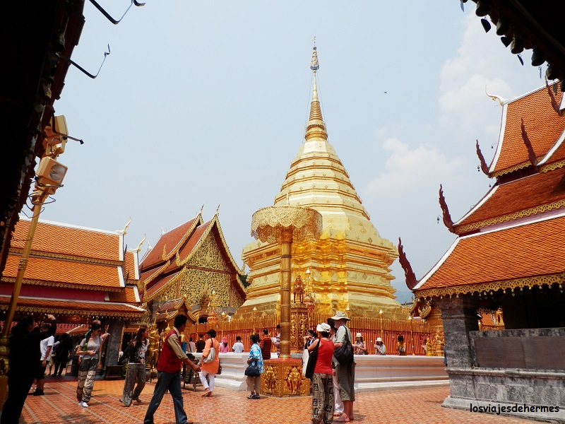 Todavía nos quedaba un templo por ver, el imprescindible Doi Suthep, que está dentro del parque natural del mismo nombre y en lo alto de una colina a unos 13 kms al oeste del centro de Chiang Mai, un templo muy importante y sagrado para los budistas que cuenta con una preciosa estupa dorada, así como otros muchos pequeños santuarios y de visita casi obligada.
