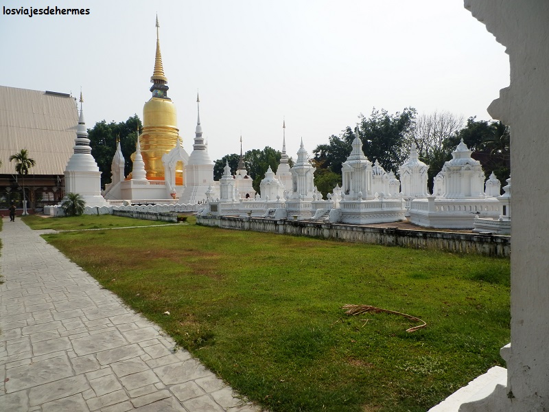 Continuamos dando un buen paseo para bajar la comida llegando al final de la calle y cogiendo a la izquierda la calle Suthep donde está la entrada a un templo más, el Wat Suan Dok, un bonito lugar con una gran estupa o “chedi” blanca acompañado de otras más pequeñas y del mismo color, además aquí y según un cartel que leímos era posible hacer cursos de meditación en inglés y había charlas con los monjes los lunes, miércoles y viernes por la tarde (ese día era martes y no fue posible, pero ya lo hicimos en el Wat Chedi Luang dos días antes). De allí regresamos al centro y al alojamiento en un taxi común por 20 THB=0,50 € cada uno, saliendo ya más tarde para cenar y pasear por el animado mercado nocturno.